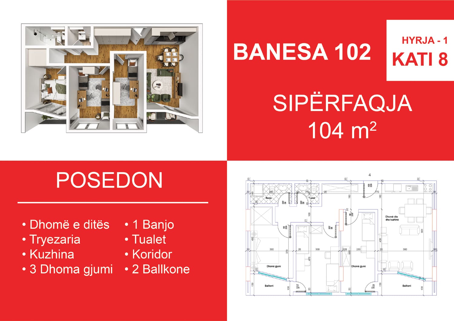 BLLOKU I RI C, HYRJA 1, KATI 8, BANESA 102, 104 m2, Dhomë e ditës, Tryezaria, Kuzhina, 3 Dhoma gjumi, 1 Banjo, Koridor, 2 Ballkone.