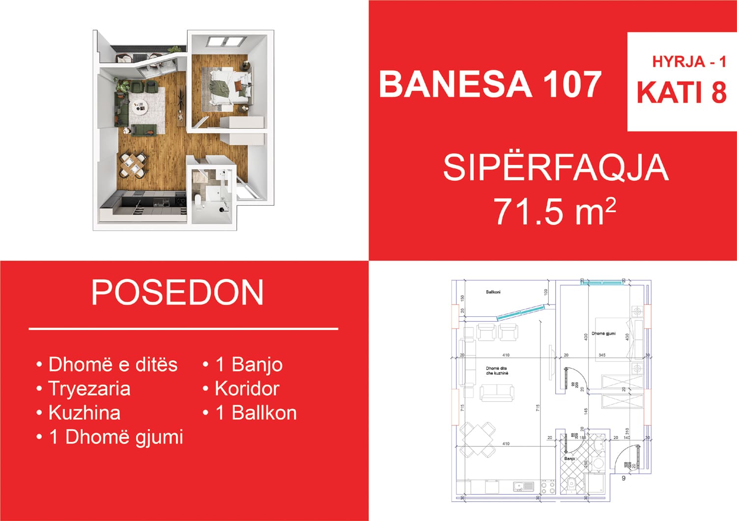 BLLOKU I RI C, HYRJA 1, KATI 8, BANESA 107, 71.5 m2, Dhomë e ditës, Tryezaria, Kuzhina, 1 Dhomë gjumi, 1 Banjo, Koridor, 1 Ballkon.