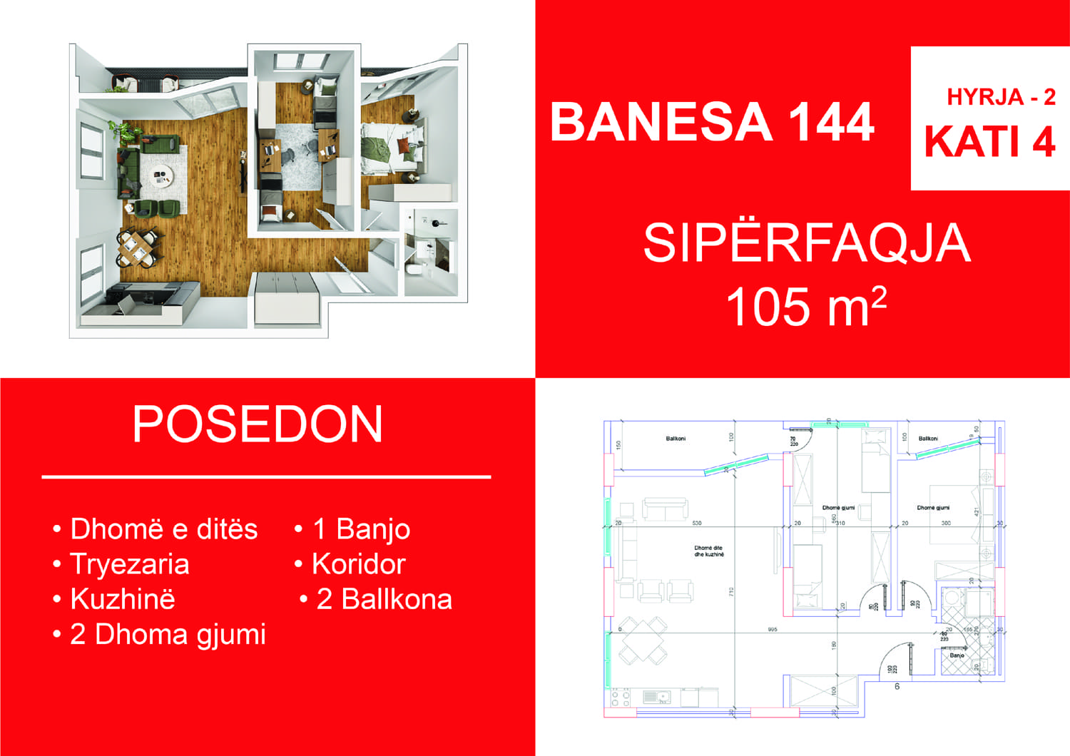 BLLOKU I RI C, HYRJA 2, KATI 4, BANESA 144, 105 m2, Dhomë e ditës, Tryezaria, Kuzhina, 2 Dhoma gjumi, 1 Banjo, Koridor, 2 Ballkone.