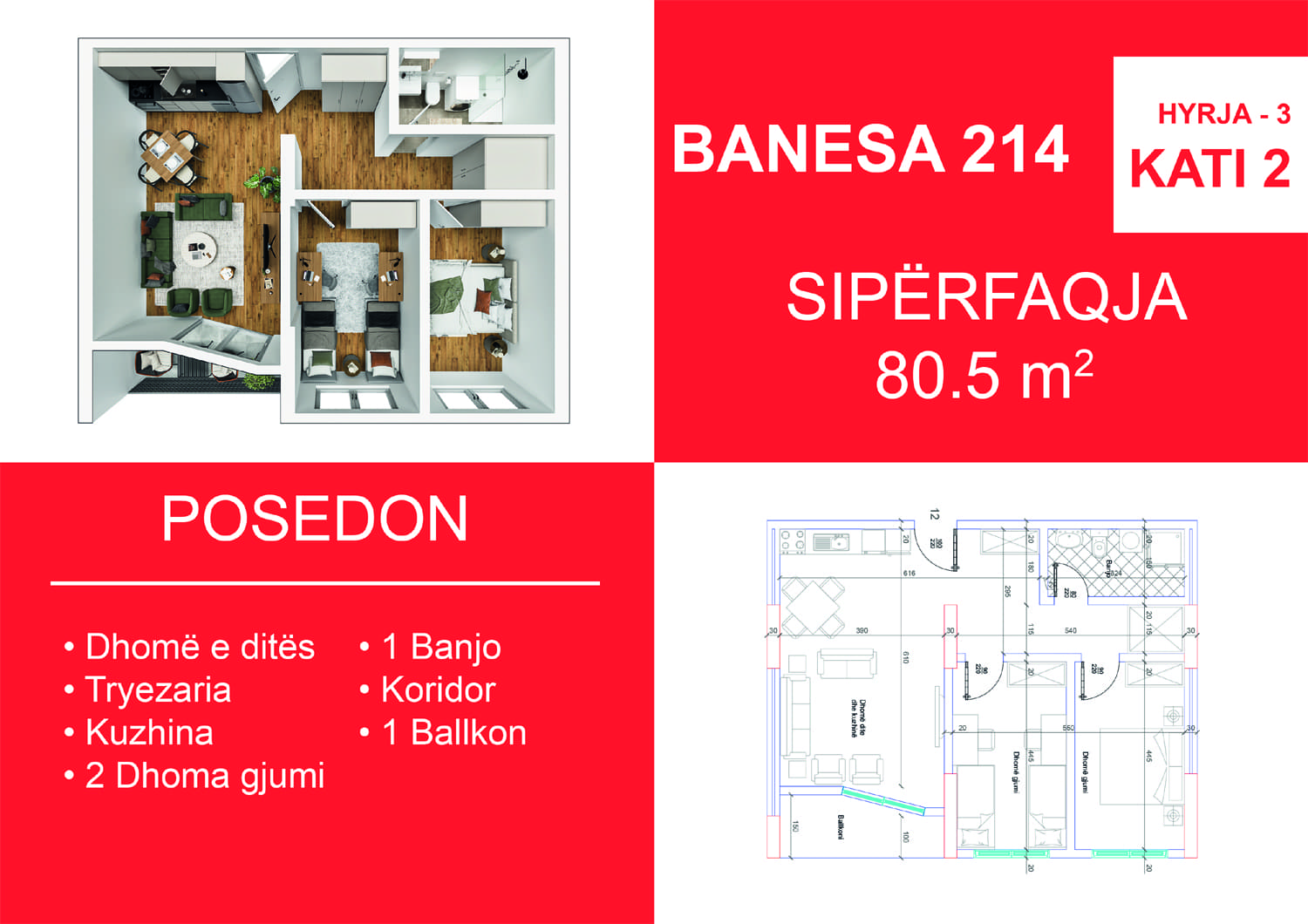 BLLOKU I RI C, HYRJA 3, KATI 2, BANESA 214, 80.5 m2, Dhomë e ditës, Tryezaria, Kuzhina, 2 Dhoma gjumi, Banjo, Koridor, Ballkon.