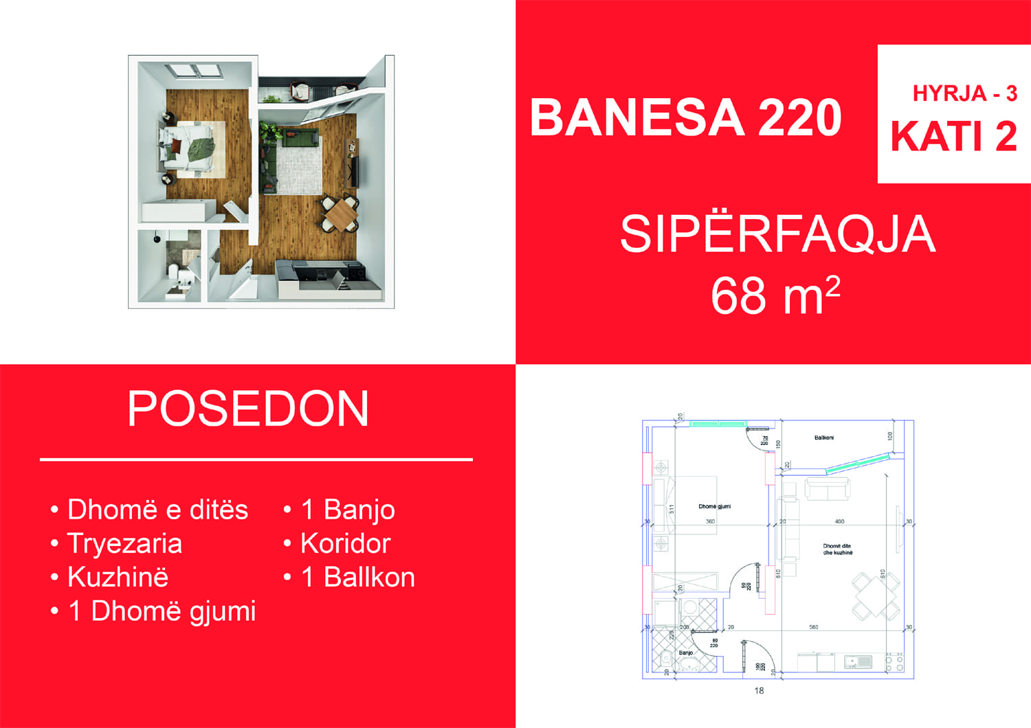 BLLOKU I RI C, HYRJA 3, KATI 2, BANESA 220, 68 m2, Dhomë e ditës, Tryezaria, Kuzhina, 1 Dhomë gjumi, Banjo, Koridor, Ballkon.