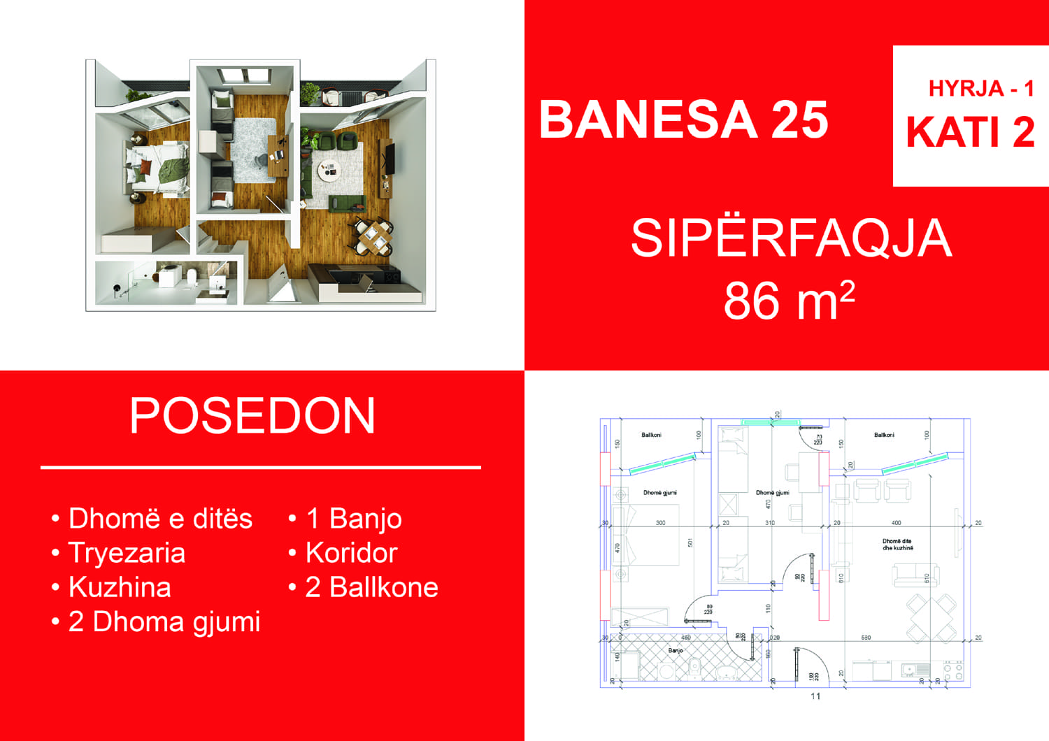 BLLOKU I RI C, HYRJA 1, KATI 2, BANESA 25, 86 m2, Dhomë e ditës, Tryezaria, Kuzhina, 2 Dhoma gjumi, 1 Banjo, Koridor, 2 Ballkone.