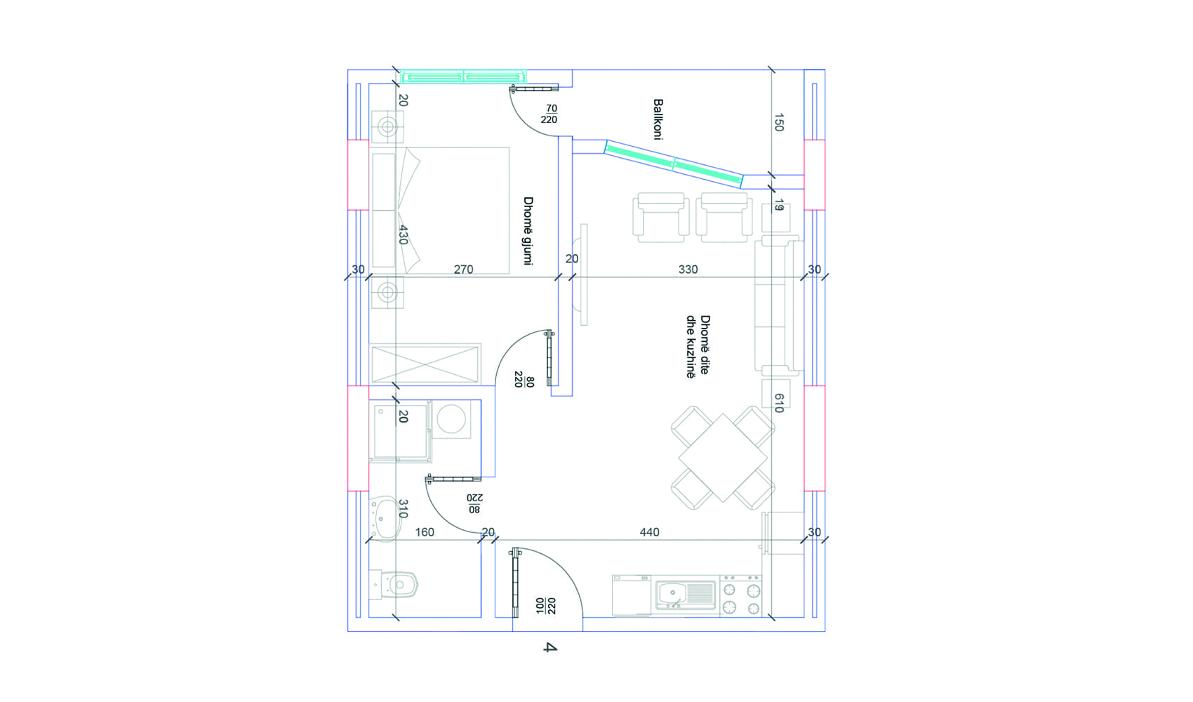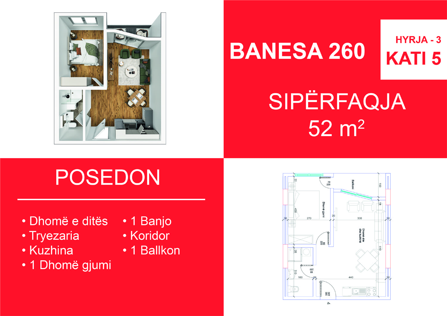 BLLOKU I RI C, HYRJA 3, KATI 5, BANESA 260, 52 m2, Dhomë e ditës, Tryezaria, Kuzhina, Dhomë gjumi, Banjo, Koridor, Ballkon.