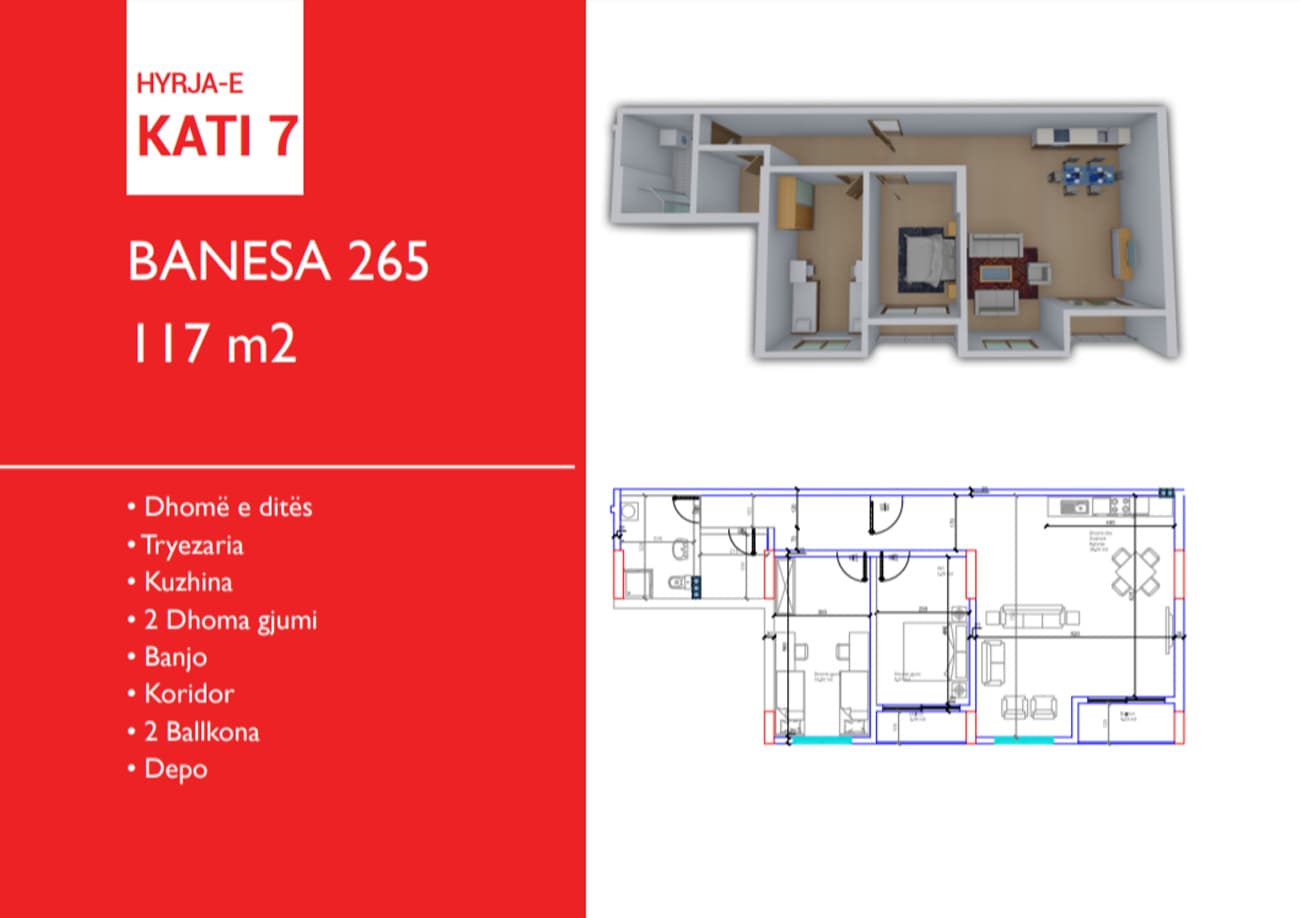 HYRJA E, KATI 7, BANESA 265, 117 m2, Dhomë e ditës, Tryezaria, Kuzhina, 2 Dhoma gjumi, Banjo, Koridor, 2 Ballkona, Depo.