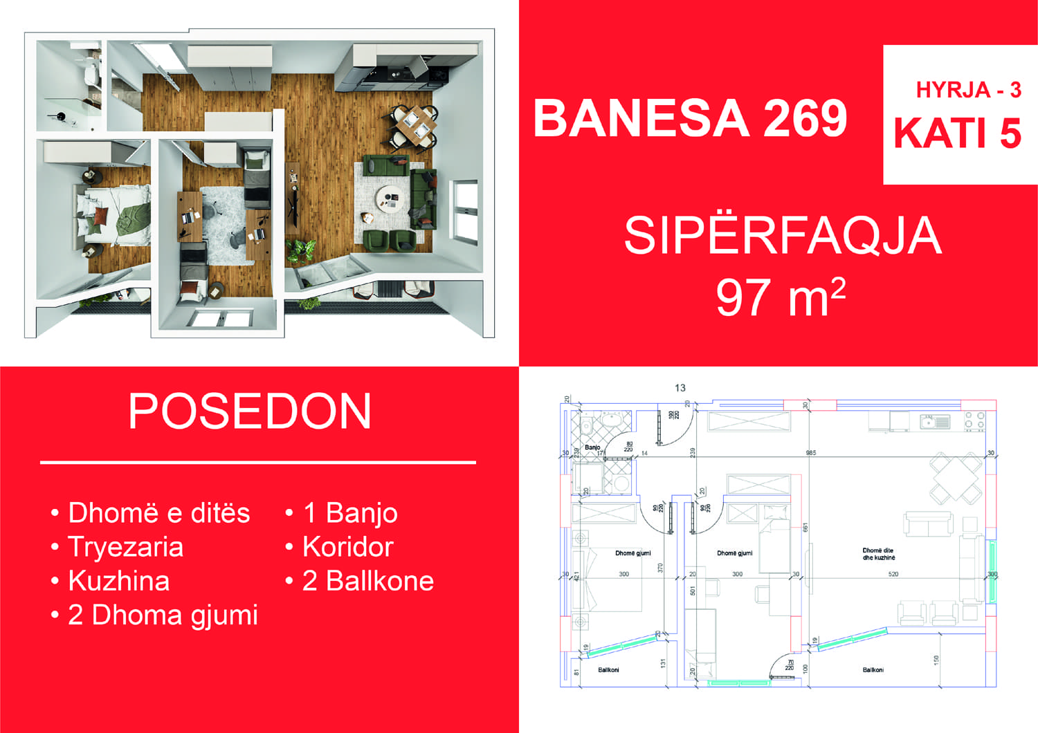 BLLOKU I RI C, HYRJA 3, KATI 5, BANESA 269, 97 m2, Dhomë e ditës, Tryezaria, Kuzhina, 2 Dhoma gjumi, Banjo, Koridor, 2 Ballkone.