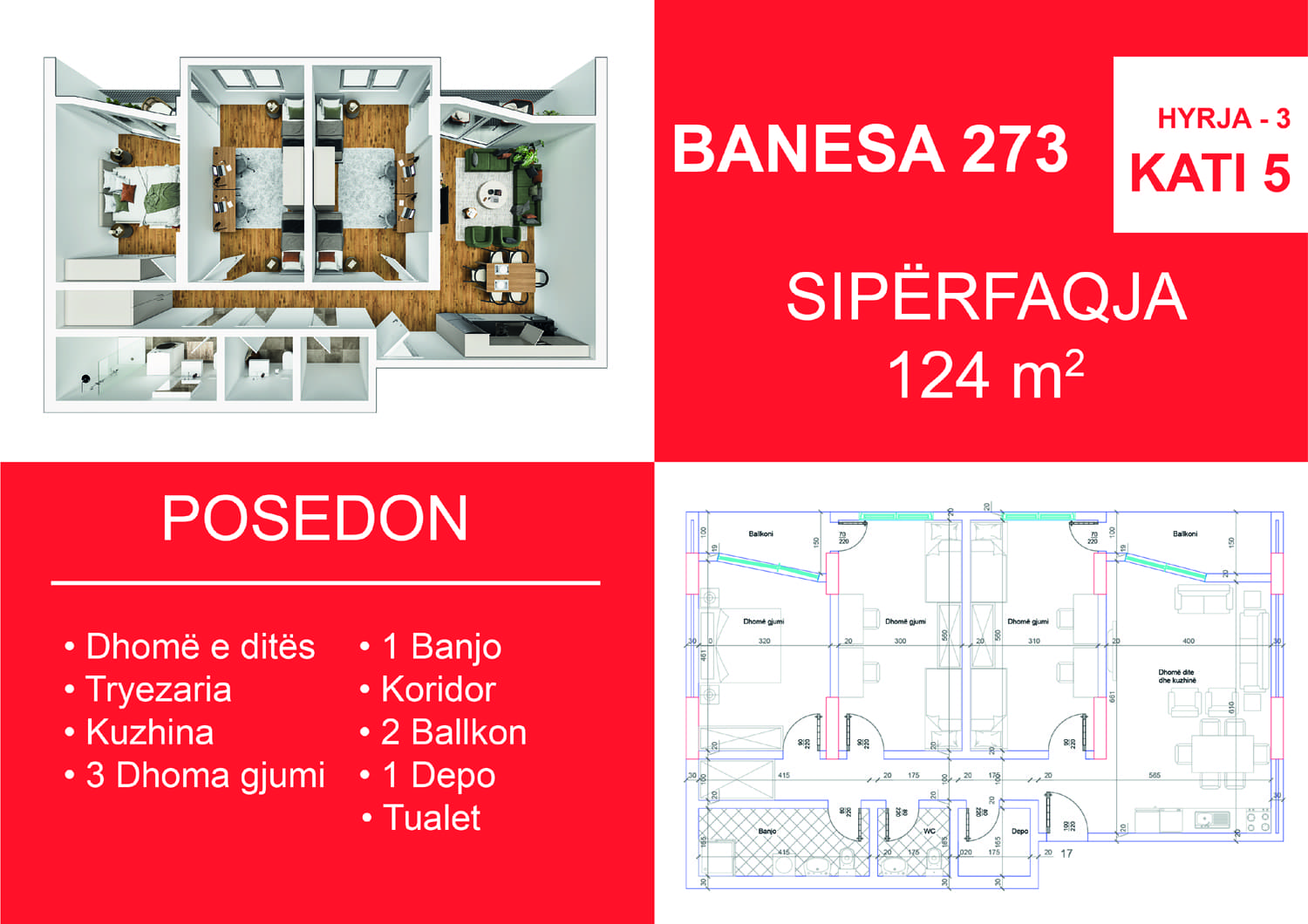 BLLOKU I RI C, HYRJA 3, KATI 5, BANESA 273, 124 m2, Dhomë e ditës, Tryezaria, Kuzhina, 3 Dhoma gjumi, Banjo, Koridor, 2 Ballkone, 1 Depo.
