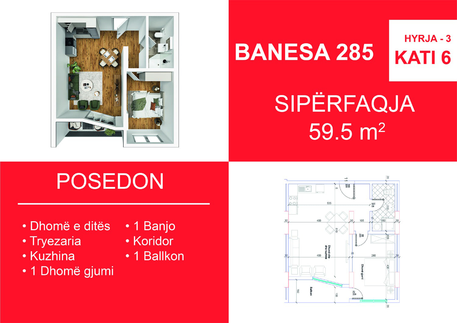 BLLOKU I RI C, HYRJA 3, KATI 6, BANESA 285, 68 m2, Dhomë e ditës, Tryezaria, Kuzhina, Dhomë gjumi, Banjo, Koridor, Ballkon.