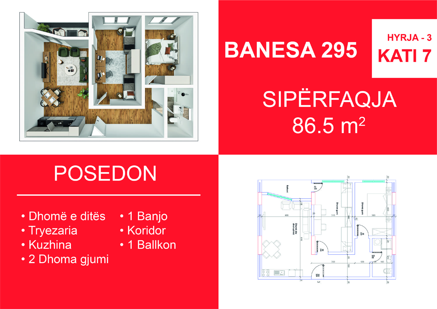BLLOKU I RI C, HYRJA 3, KATI 7, BANESA 295, 86.5 m2, Dhomë e ditës, Tryezaria, Kuzhina, 2 Dhoma gjumi, Banjo, Koridor, Ballkon.