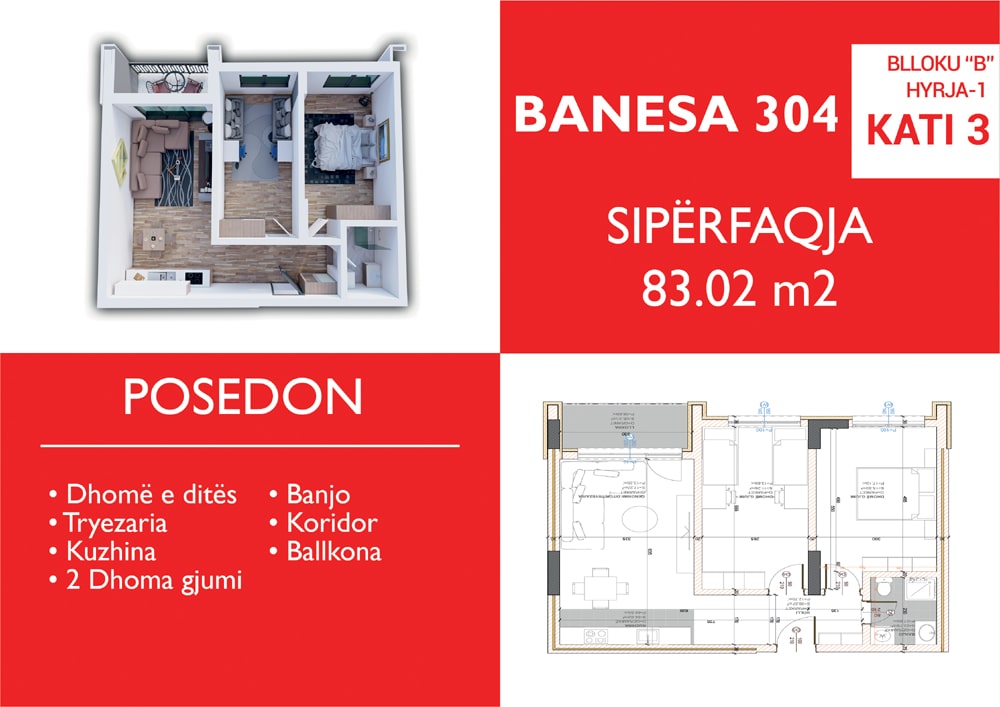BLLOKU B, HYRJA 1, KATI 3, BANESA 304, 83.02 m2, Dhomë e ditës, Tryezaria, Kuzhina, 2 Dhoma gjumi, Banjo, Koridor, Ballkon.