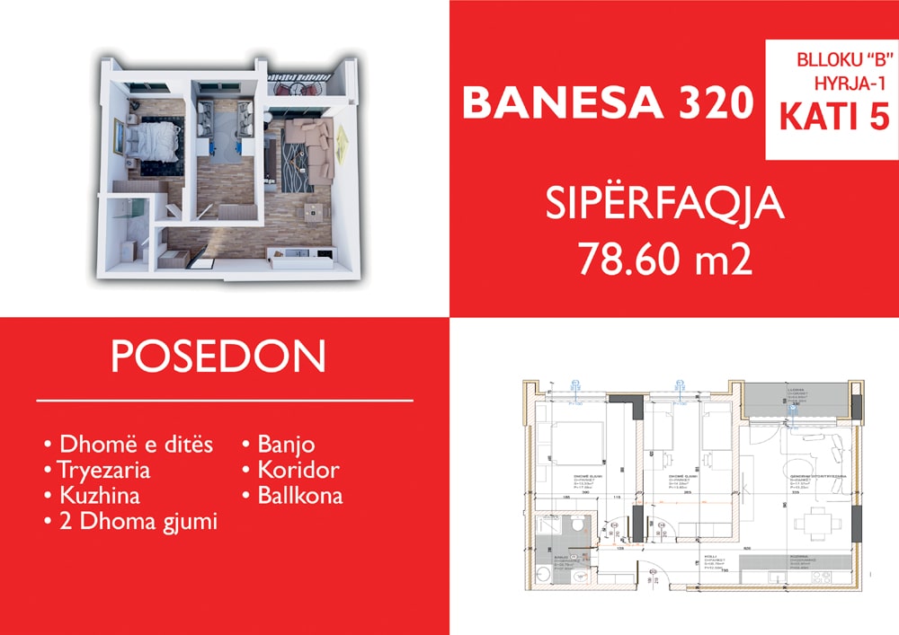 BLLOKU B, HYRJA 1, KATI 5, BANESA 320, 78.60 m2, Dhomë e ditës, Tryezaria, Kuzhina, 2 Dhoma gjumi, Banjo, Koridor, Ballkon.