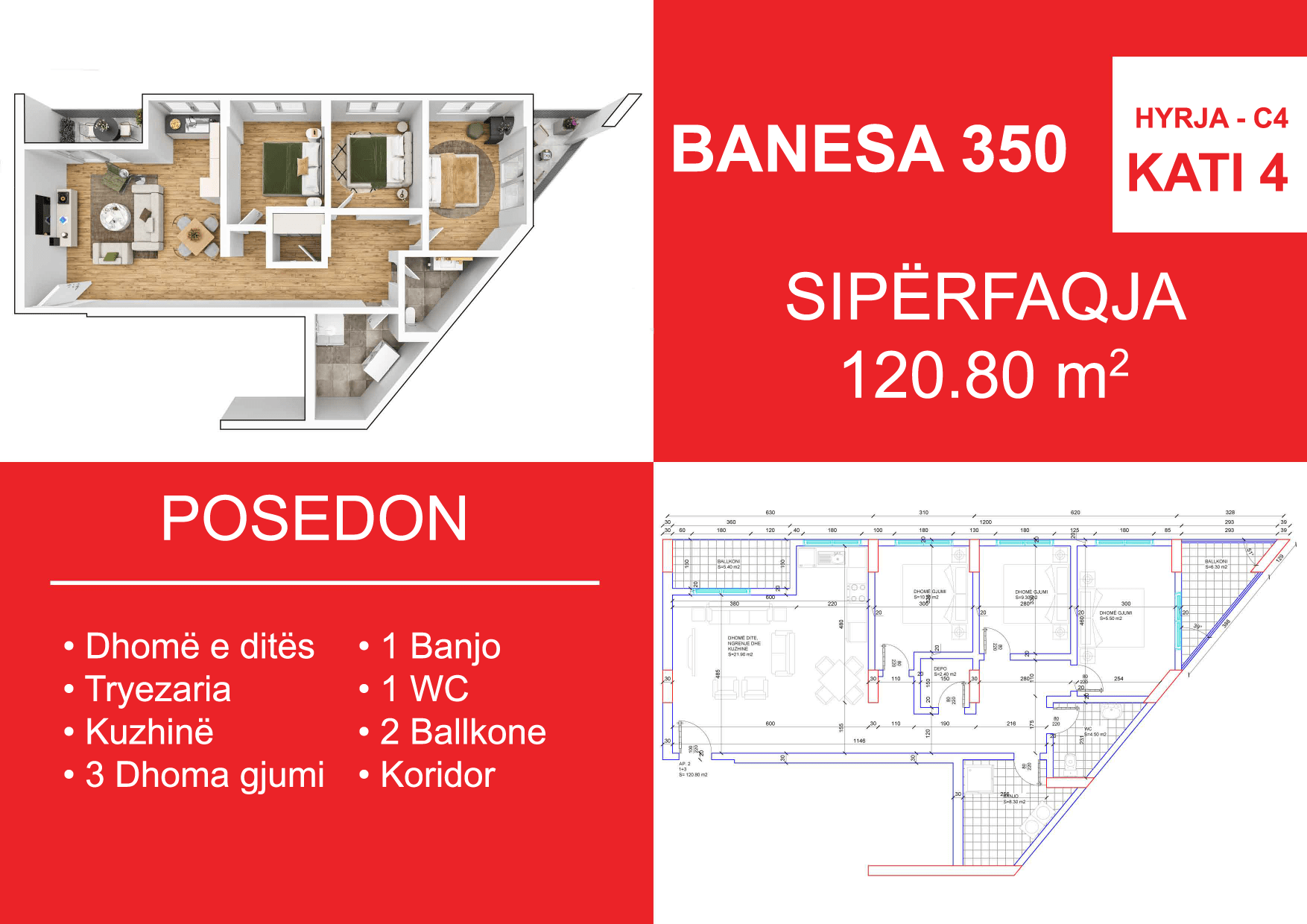 BLLOKU I RI C4-C12, HYRJA C4, KATI 4, BANESA 350, 120.80 m2, Dhomë e ditës, Tryezaria, Kuzhina, 3 Dhoma gjumi, 1 Banjo, 1 WC, Koridor, 2 Ballkone.