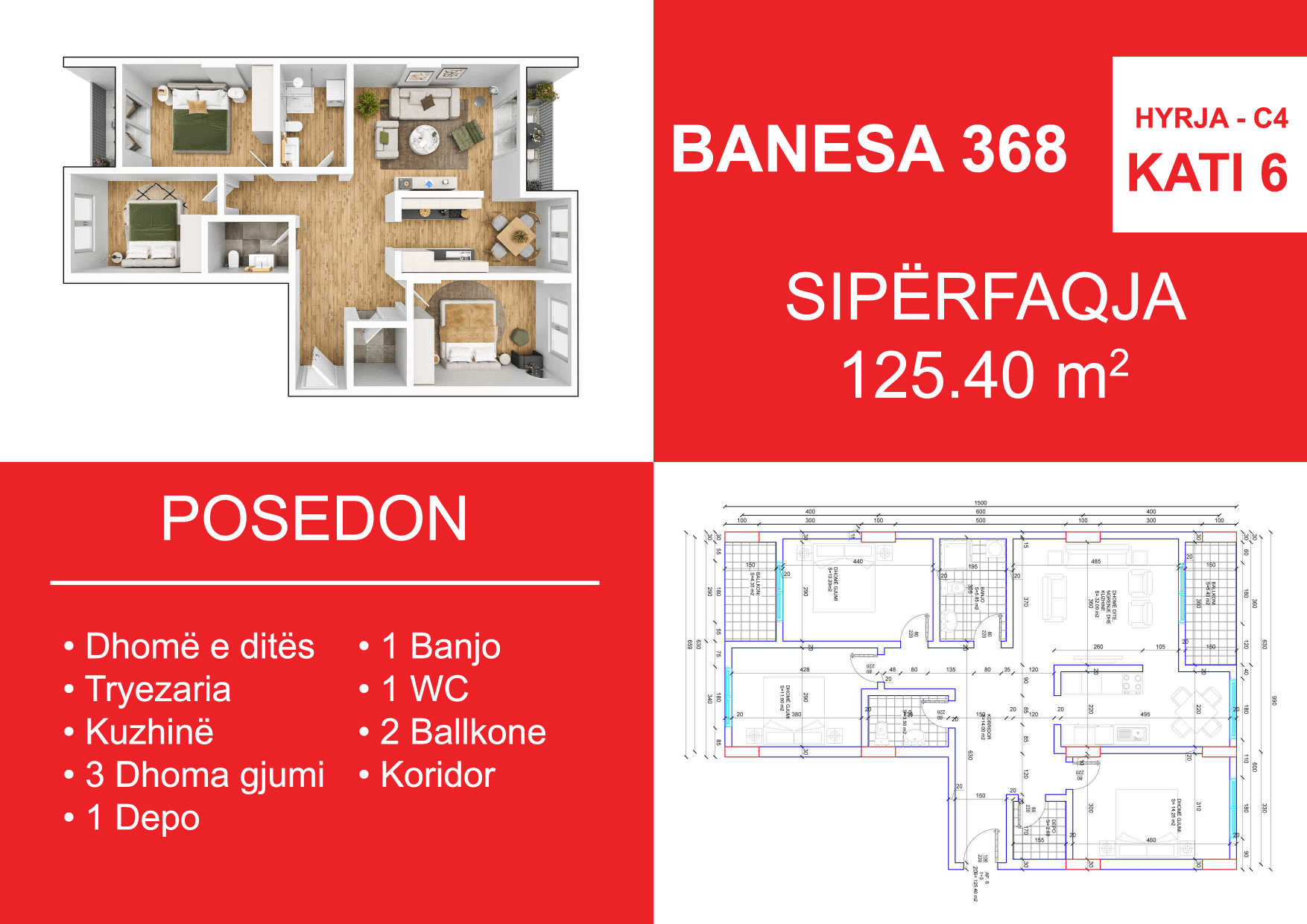 BLLOKU I RI C4-C12, HYRJA C4, KATI 6, BANESA 368, 125.40 m2, Dhomë e ditës, Tryezaria, Kuzhina, 3 Dhoma gjumi, 1 Banjo, 1 WC, Koridor, 2 Ballkone, 1 Depo.
