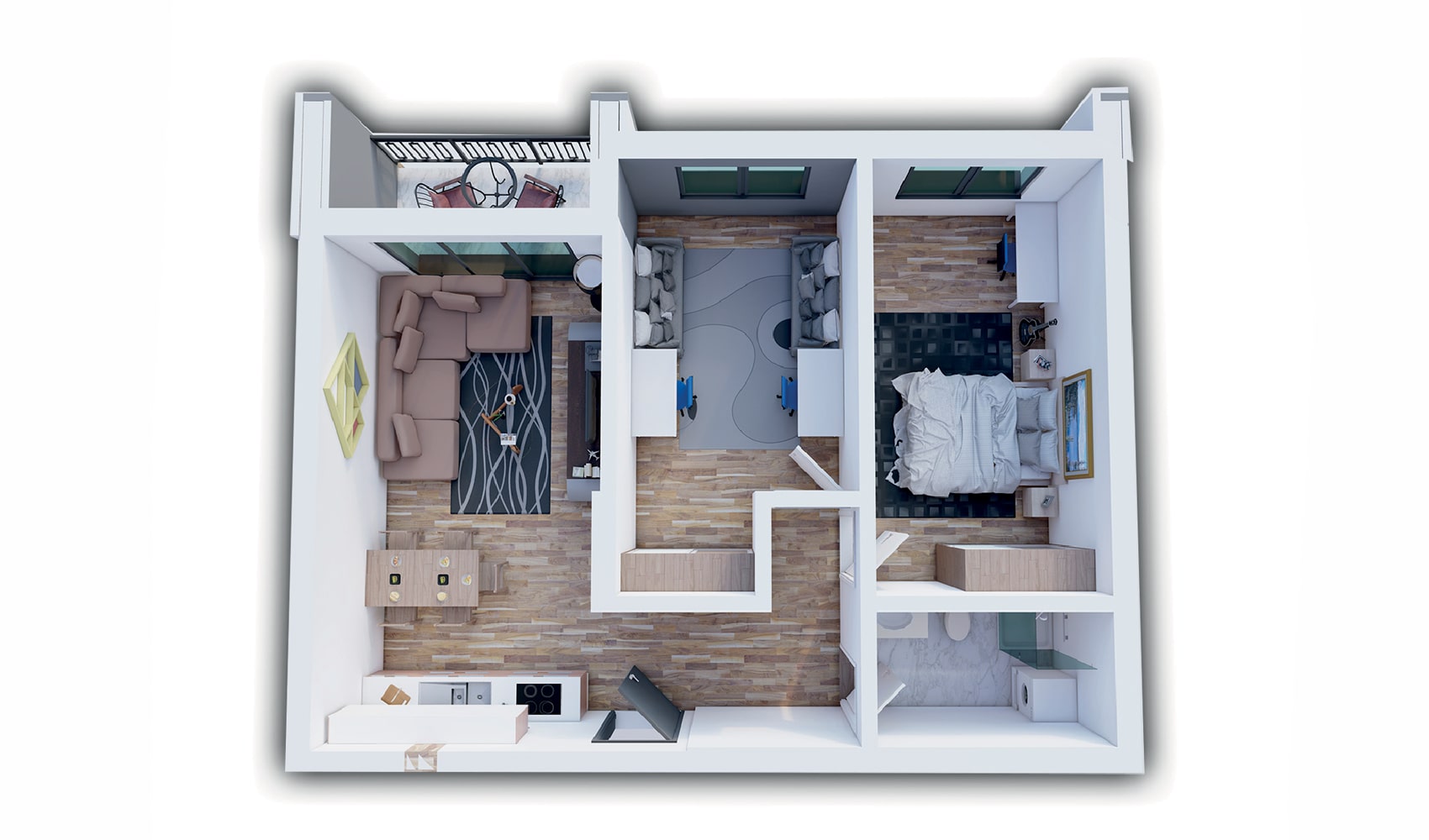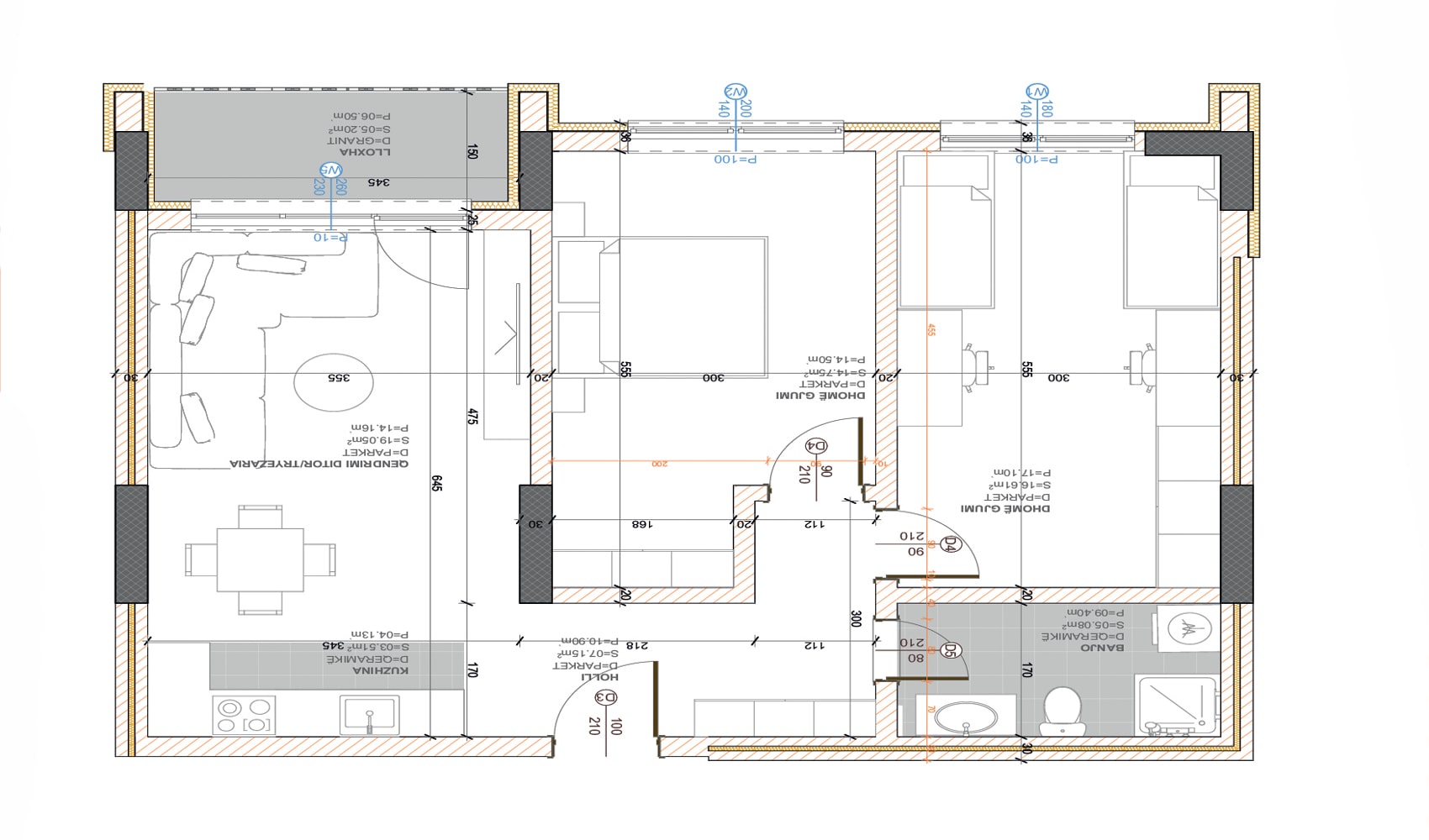 BLLOKU B, HYRJA 2, KATI 2, BANESA 377, 82.64 m2, Dhomë e ditës, Tryezaria, Kuzhina, 2 Dhoma gjumi, Banjo, Koridor, Ballkon.