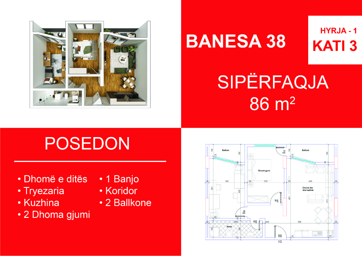 BLLOKU I RI C, HYRJA 1, KATI 3, BANESA 38, 86 m2, Dhomë e ditës, Tryezaria, Kuzhina, 2 Dhoma gjumi, 1 Banjo, Koridor, 2 Ballkone.
