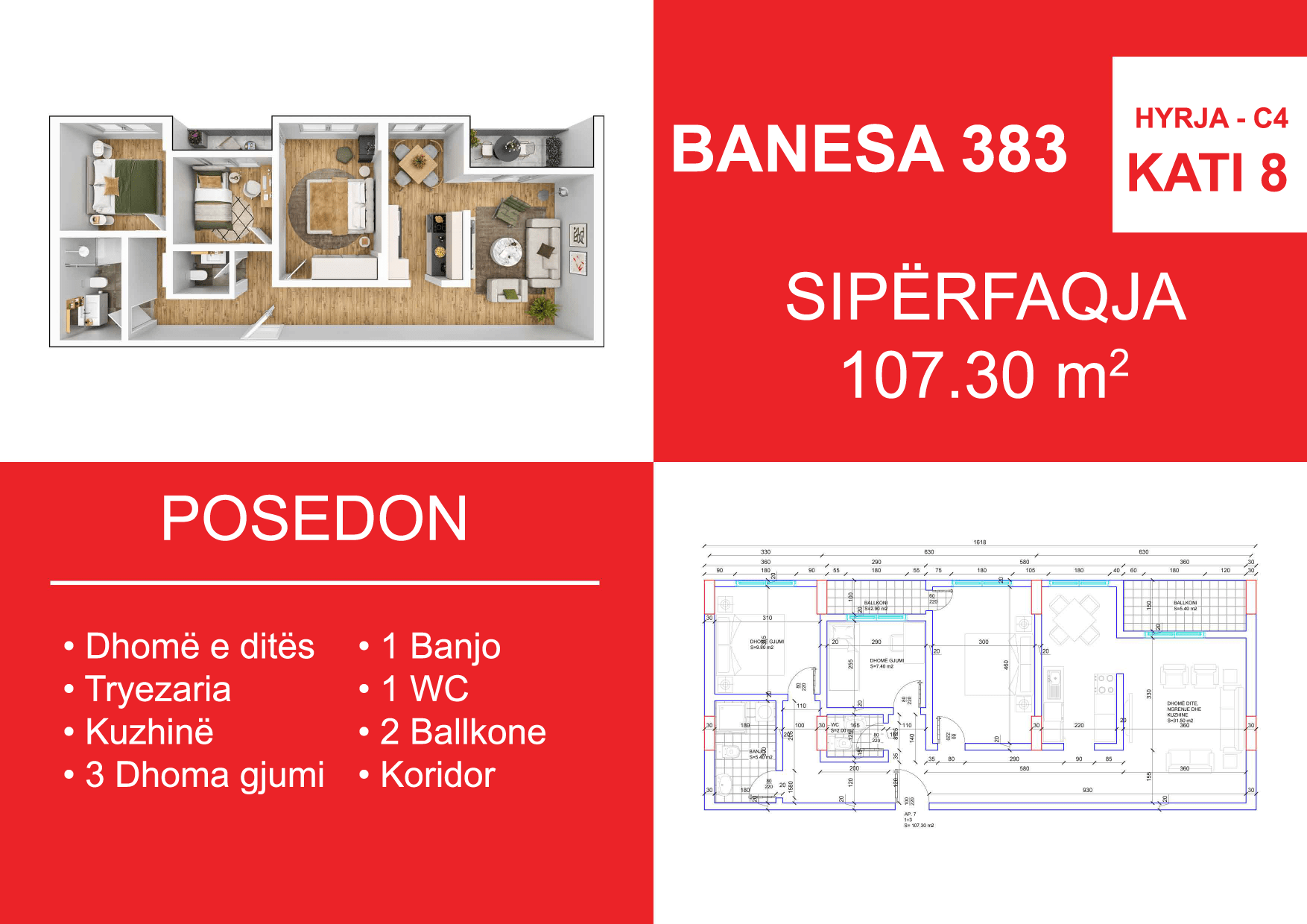 BLLOKU I RI C4-C12, HYRJA C4, KATI 8, BANESA 383, 107.30 m2, Dhomë e ditës, Tryezaria, Kuzhina, 3 Dhoma gjumi, 1 Banjo, 1 WC, Koridor, 2 Ballkone.