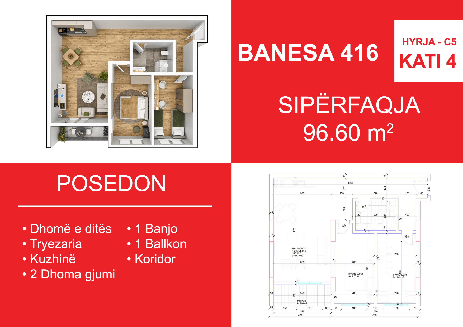 BLLOKU I RI C4-C12, HYRJA C5, KATI 4, BANESA 416, 96.60 m2, Dhomë e ditës, Tryezaria, Kuzhina, 2 Dhomë gjumi, 1 Banjo, Koridor, Ballkon.