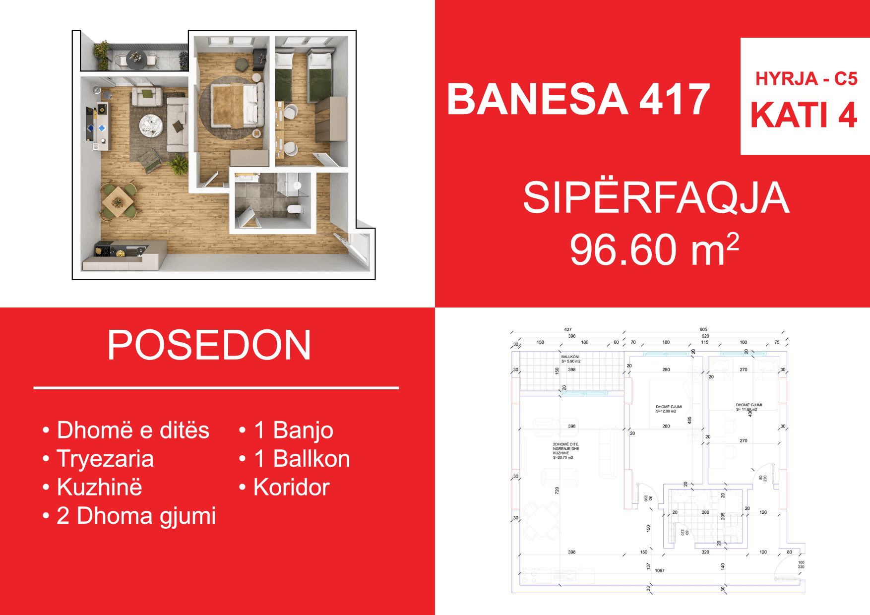BLLOKU I RI C4-C12, HYRJA C5, KATI 4, BANESA 417, 96.60 m2, Dhomë e ditës, Tryezaria, Kuzhina, 2 Dhomë gjumi, 1 Banjo, Koridor, Ballkon.