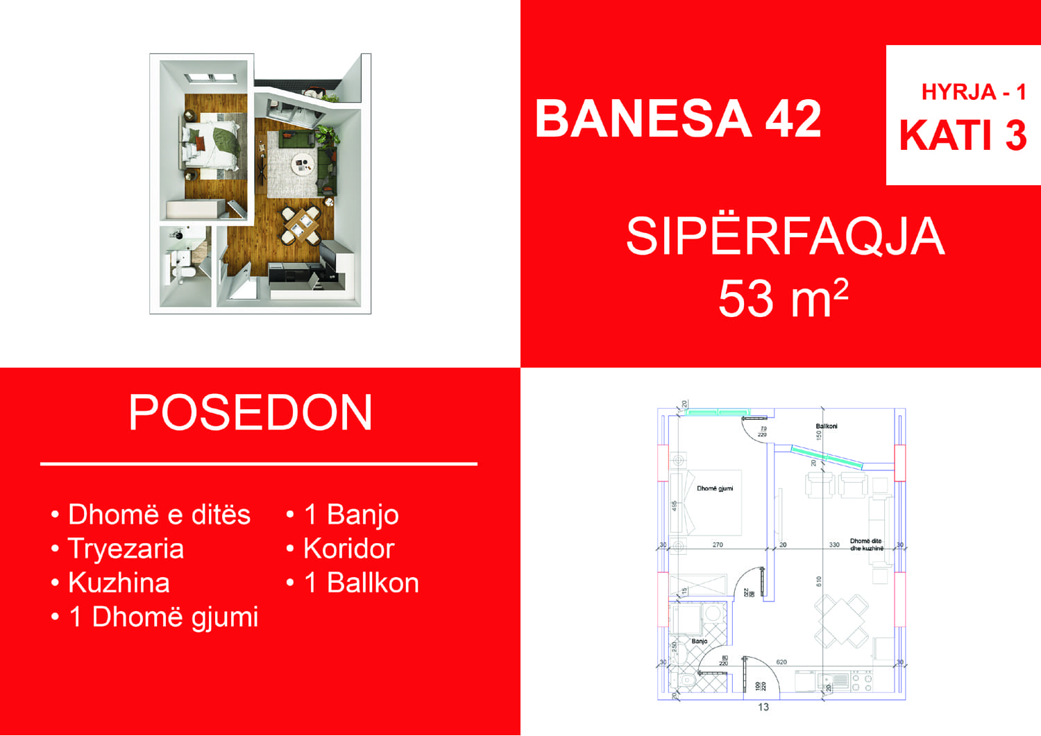 BLLOKU I RI C, HYRJA 1, KATI 3, BANESA 42, 53 m2, Dhomë e ditës, Tryezaria, Kuzhina, 1 Dhomë gjumi, 1 Banjo, Koridor, 1 Ballkon.
