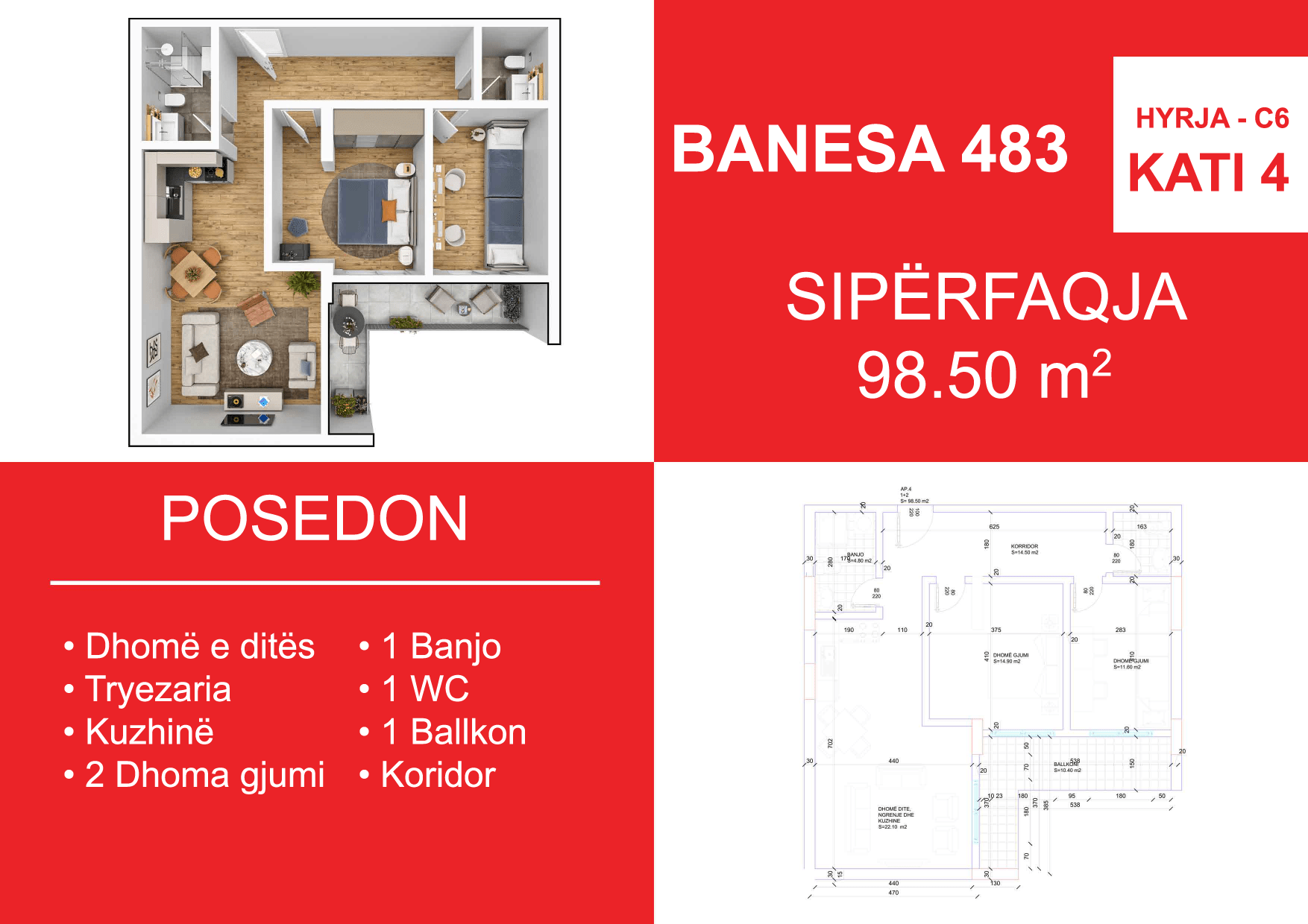 BLLOKU I RI C4-C12, HYRJA C6, KATI 4, BANESA 483, 98.50 m2, Dhomë e ditës, Tryezaria, Kuzhina, 2 Dhoma gjumi, 1 Banjo, 1 WC, Koridor, 1 Ballkon.