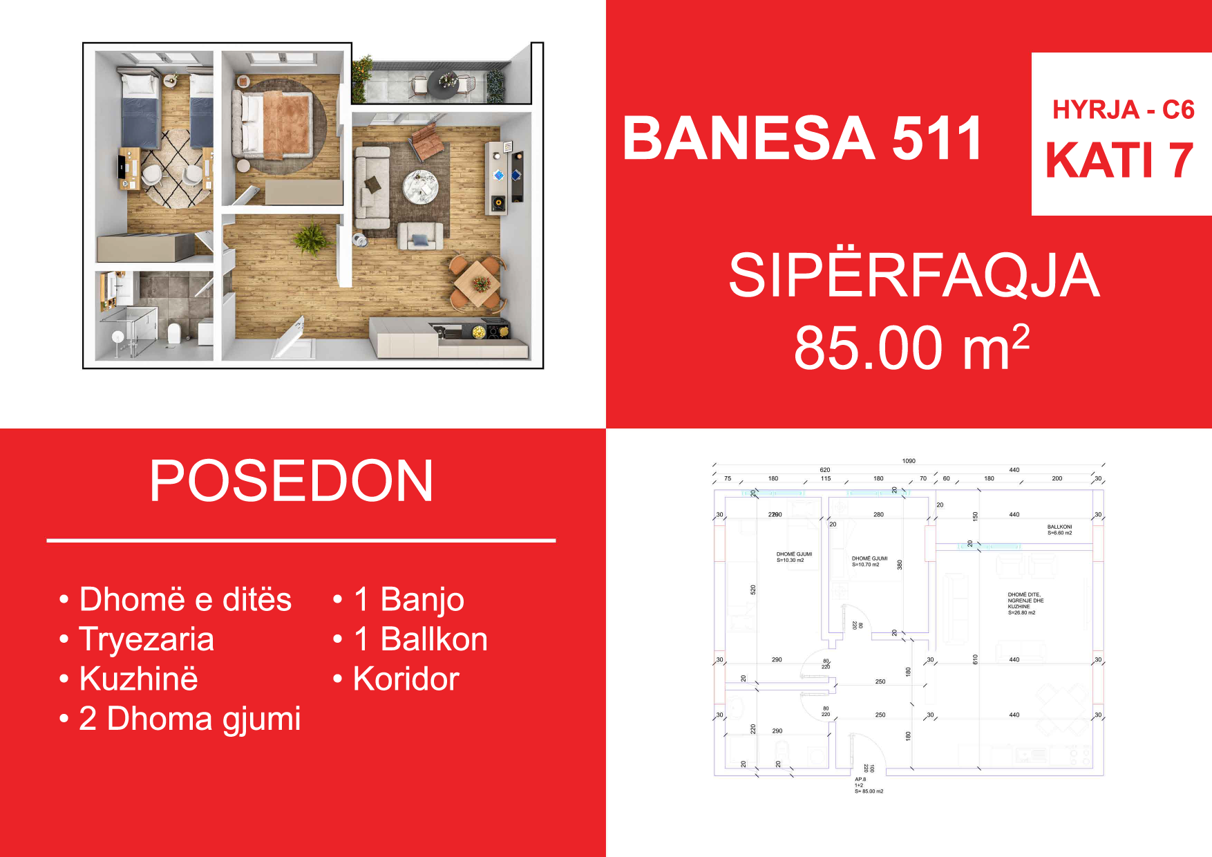 BLLOKU I RI C4-C12, HYRJA C6, KATI 7, BANESA 511, 85.00 m2, Dhomë e ditës, Tryezaria, Kuzhina, 2 Dhoma gjumi, 1 Banjo, Koridor, 1 Ballkon.