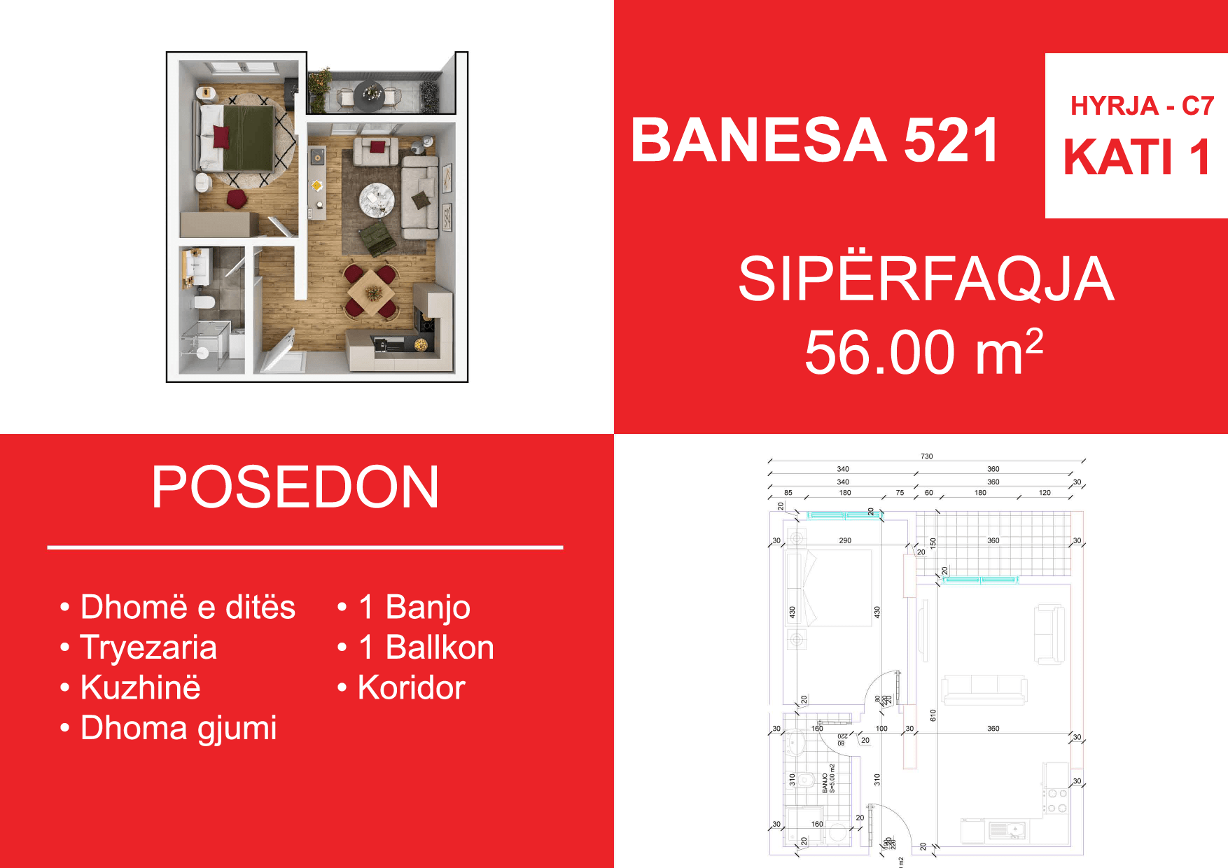 BLLOKU I RI C4-C12, HYRJA C7, KATI 1, BANESA 521, 56.00 m2, Dhomë e ditës, Tryezaria, Kuzhina, 1 Dhomë gjumi, 1 Banjo, Koridor, 1 Ballkon.