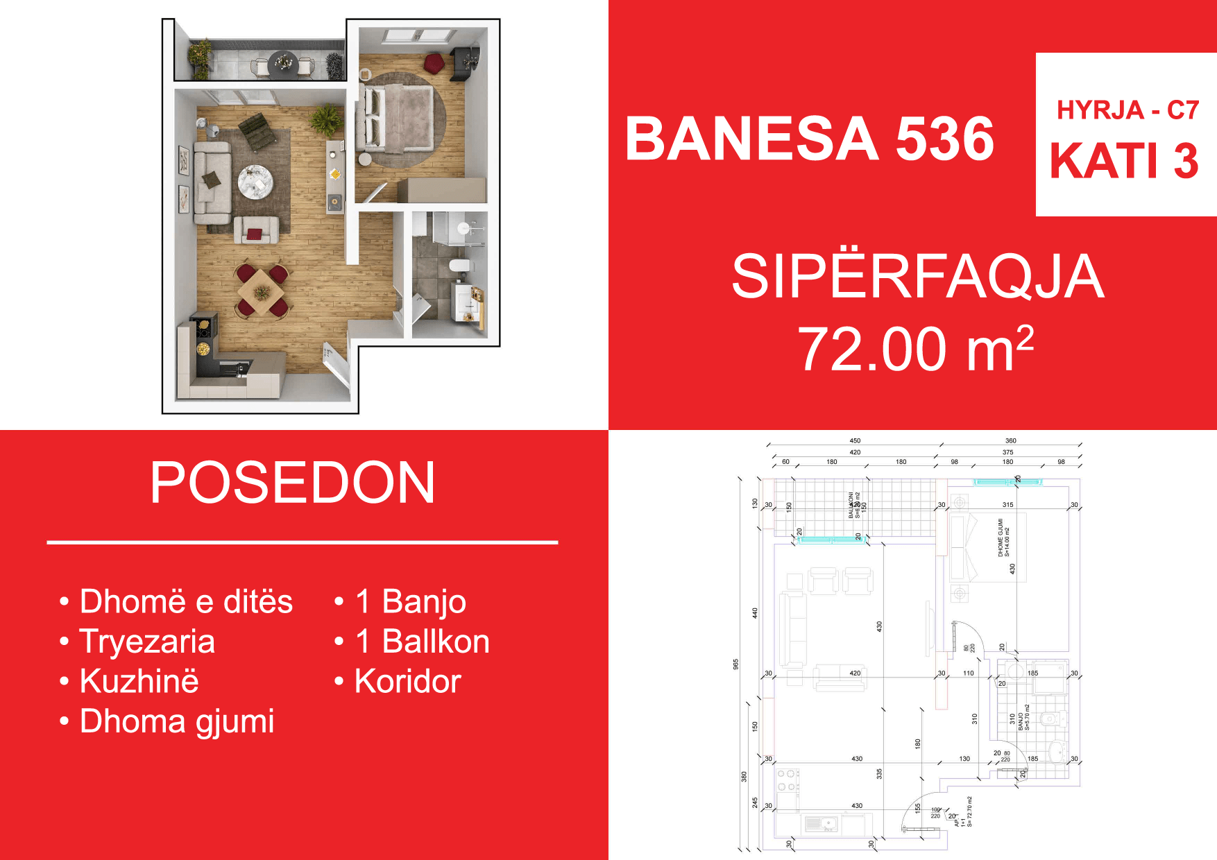 BLLOKU I RI C4-C12, HYRJA C7, KATI 3, BANESA 536, 72.00 m2, Dhomë e ditës, Tryezaria, Kuzhina, 1 Dhoma gjumi, 1 Banjo, Koridor, 1 Ballkon.
