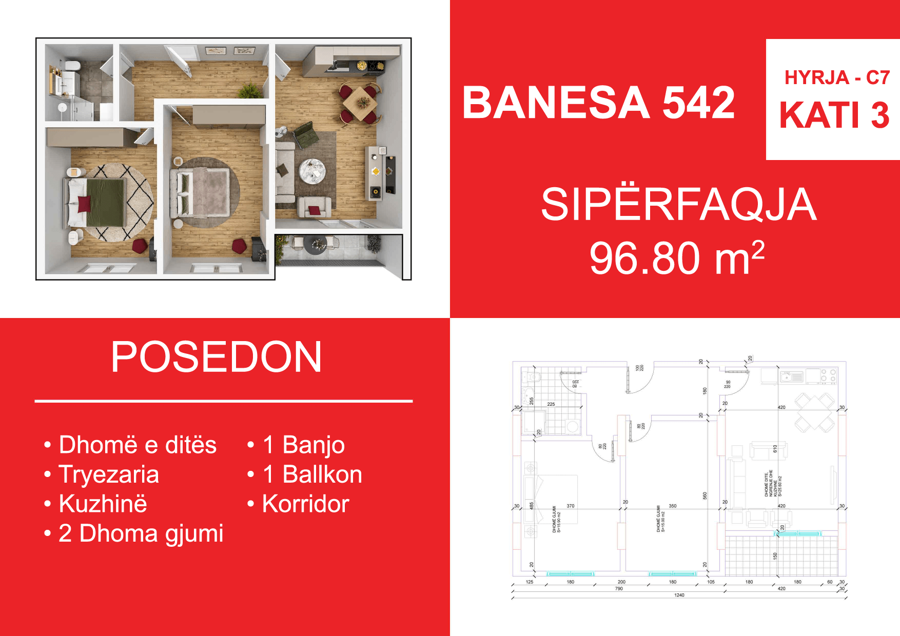 BLLOKU I RI C4-C12, HYRJA C7, KATI 3, BANESA 542, 96.80 m2, Dhomë e ditës, Tryezaria, Kuzhina, 2 Dhoma gjumi, 1 Banjo, Koridor, 1 Ballkon.