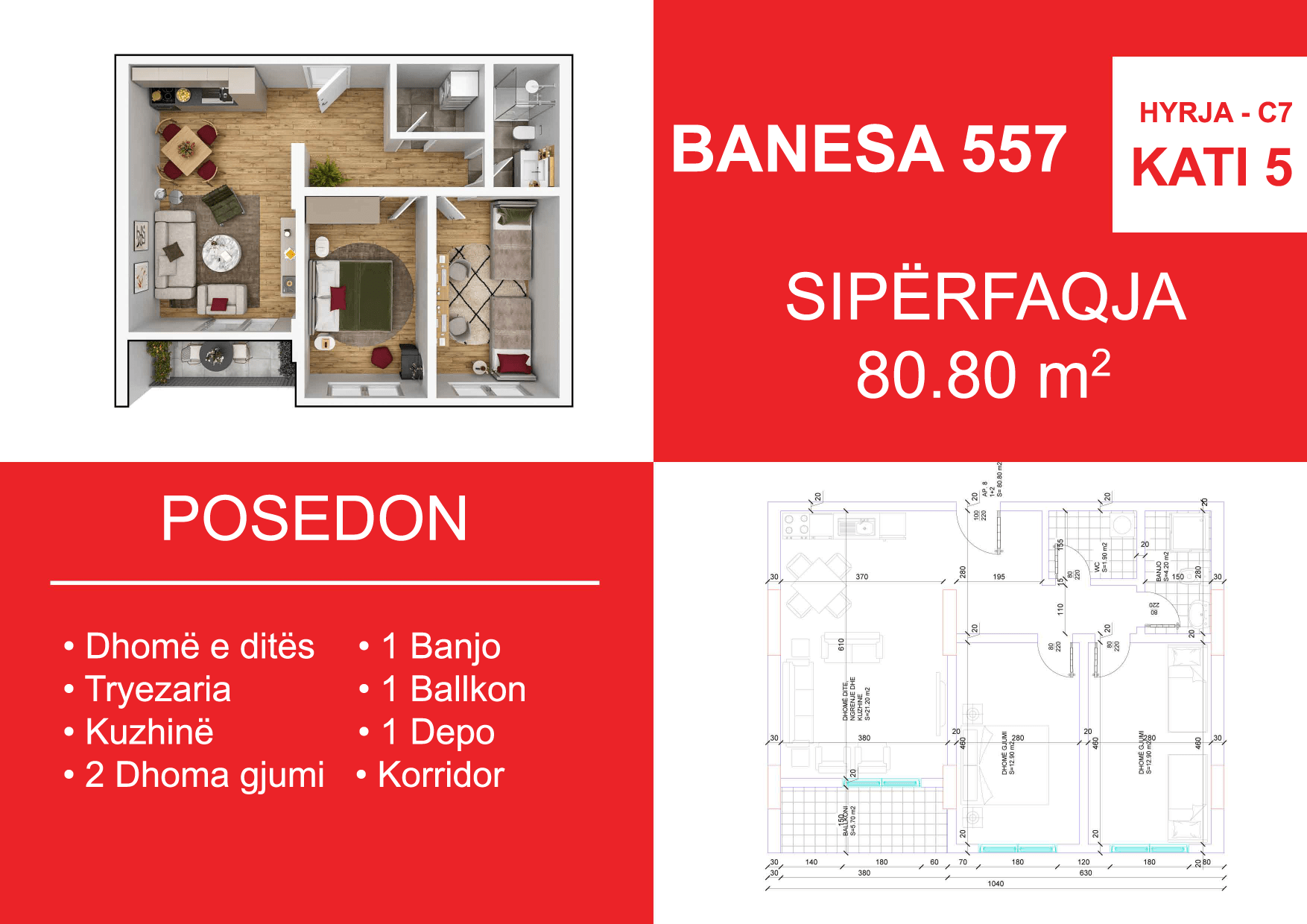 BLLOKU I RI C4-C12, HYRJA C7, KATI 5, BANESA 557, 80.80 m2, Dhomë e ditës, Tryezaria, Kuzhina, 2 Dhoma gjumi, 1 Banjo, Koridor, 1 Depo, 1 Ballkon.