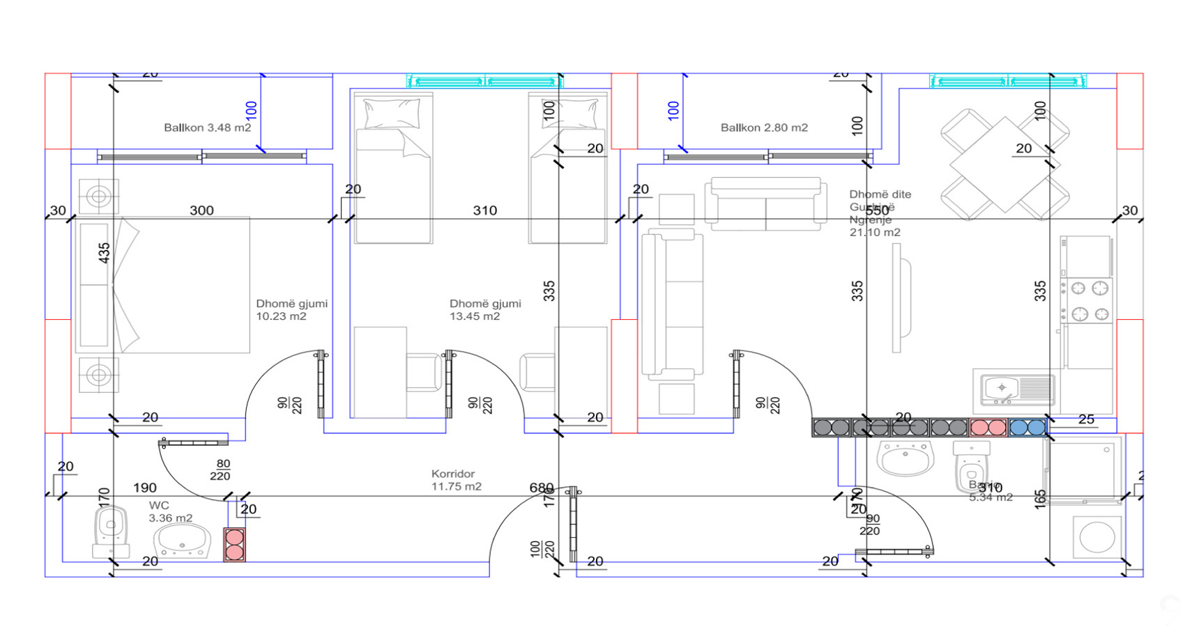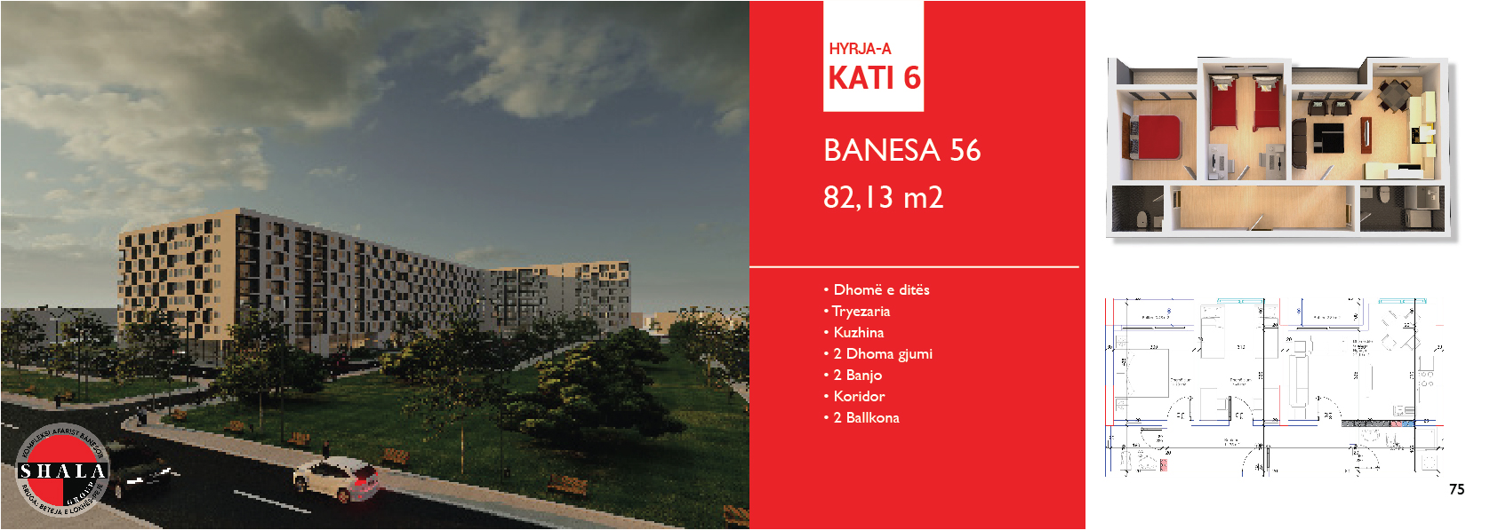 HYRJA A, KATI 6, BANESA 56, 82.13 m2, Dhomë e ditës, Tryezaria, Kuzhina, 2 Dhoma gjumi, 2 Banjo, Koridor, 2 Ballkona.