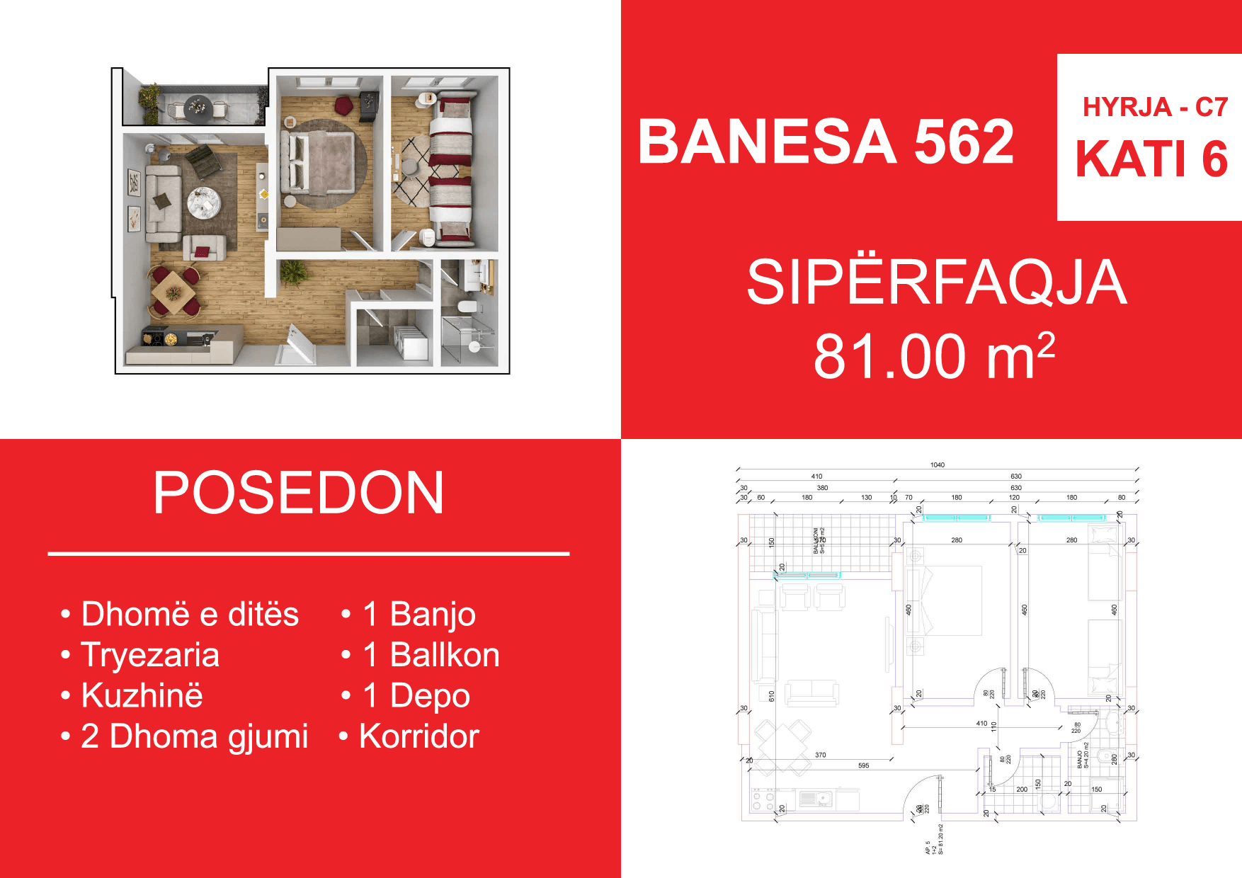 BLLOKU I RI C4-C12, HYRJA C7, KATI 6, BANESA 562, 81.00 m2, Dhomë e ditës, Tryezaria, Kuzhina, 2 Dhoma gjumi, 1 Banjo, Koridor, Depo, 1 Ballkon.