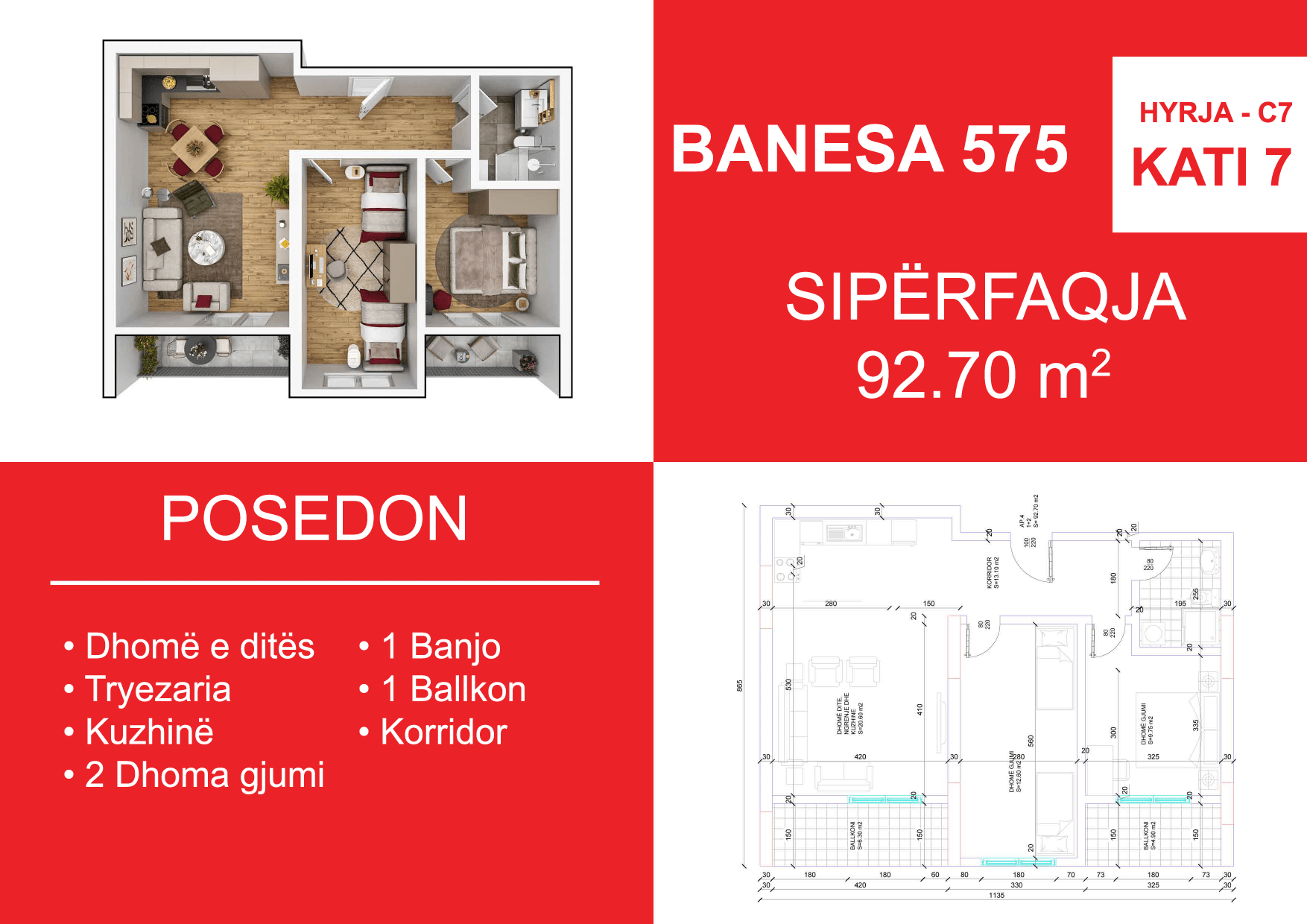 BLLOKU I RI C4-C12, HYRJA C7, KATI 7, BANESA 575, 92.70 m2, Dhomë e ditës, Tryezaria, Kuzhina, 2 Dhoma gjumi, 1 Banjo, Koridor, 1 Ballkon.