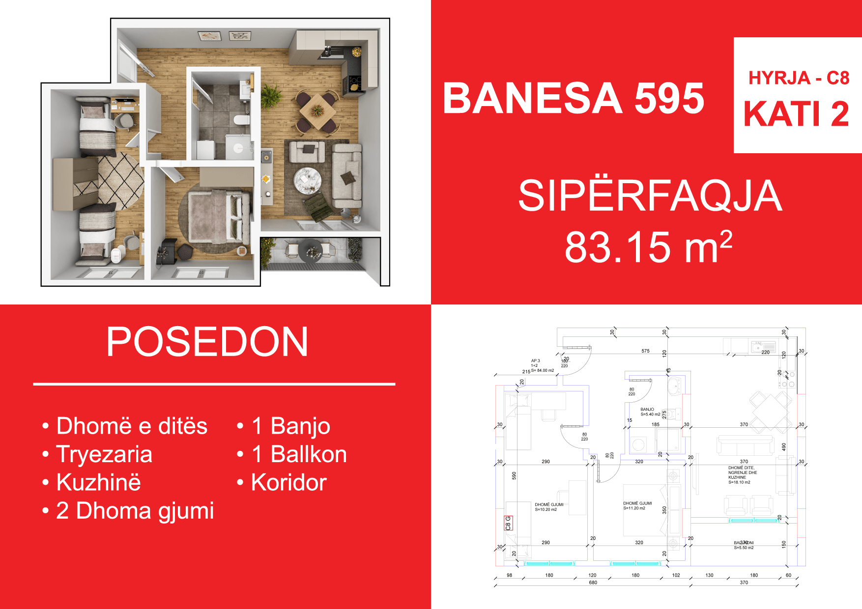 BLLOKU I RI C4-C12, HYRJA C8, KATI 2, BANESA 595, 83.15 m2, Dhomë e ditës, Tryezaria, Kuzhina, 2 Dhoma gjumi, 1 Banjo, Koridor, 1 Ballkon.