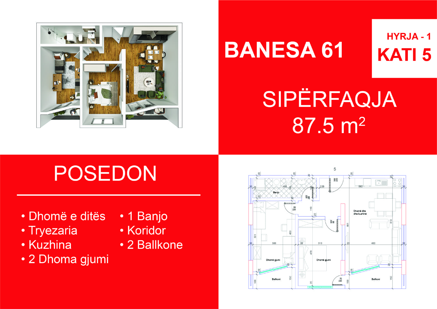 BLLOKU I RI C, HYRJA 1, KATI 5, BANESA 61, 87.5 m2, Dhomë e ditës, Tryezaria, Kuzhina, 2 Dhoma gjumi, 1 Banjo, Koridor, 2 Ballkone.