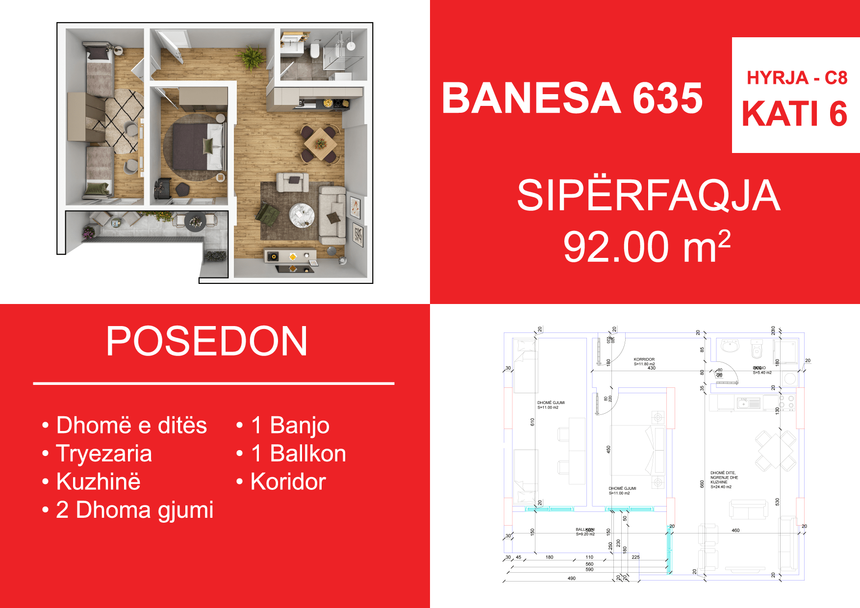 BLLOKU I RI C4-C12, HYRJA C8, KATI 6, BANESA 635, 92.00 m2, Dhomë e ditës, Tryezaria, Kuzhina, 2 Dhoma gjumi, 1 Banjo, Koridor, 1 Ballkon.