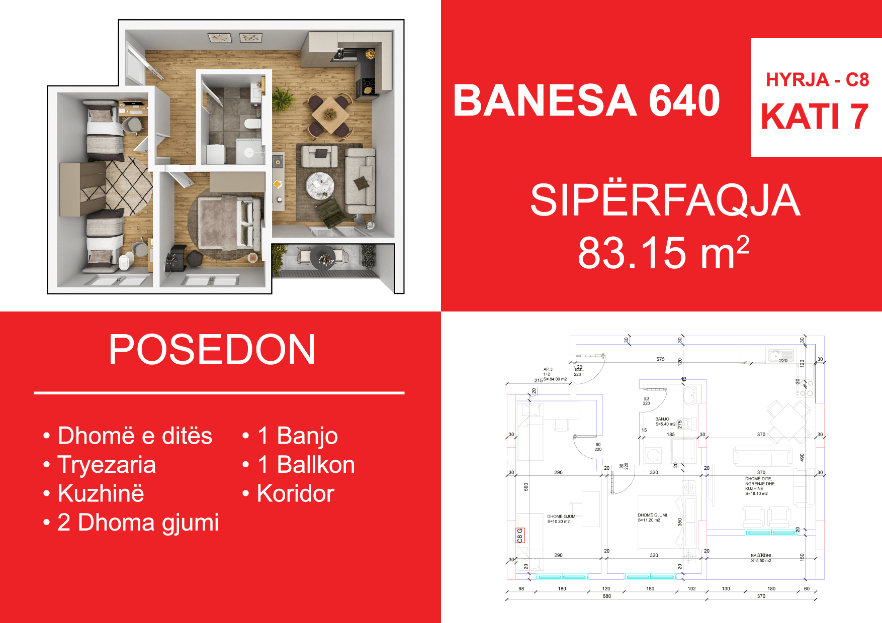 BLLOKU I RI C4-C12, HYRJA C8, KATI 7, BANESA 640, 83.15 m2, Dhomë e ditës, Tryezaria, Kuzhina, 2 Dhoma gjumi, 1 Banjo, Koridor, 1 Ballkon.