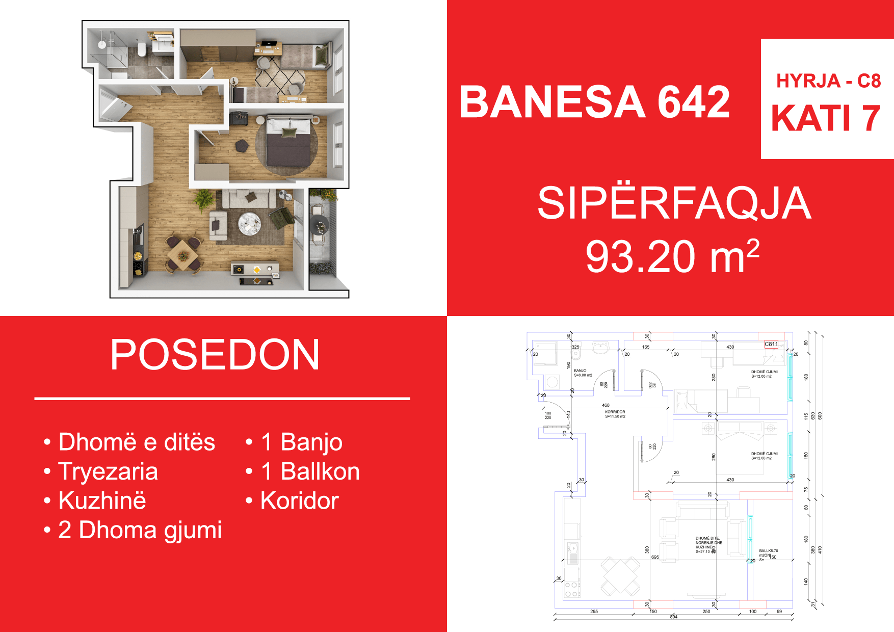 BLLOKU I RI C4-C12, HYRJA C8, KATI 7, BANESA 642, 93.20 m2, Dhomë e ditës, Tryezaria, Kuzhina, 2 Dhoma gjumi, 1 Banjo, Koridor, 1 Ballkon.