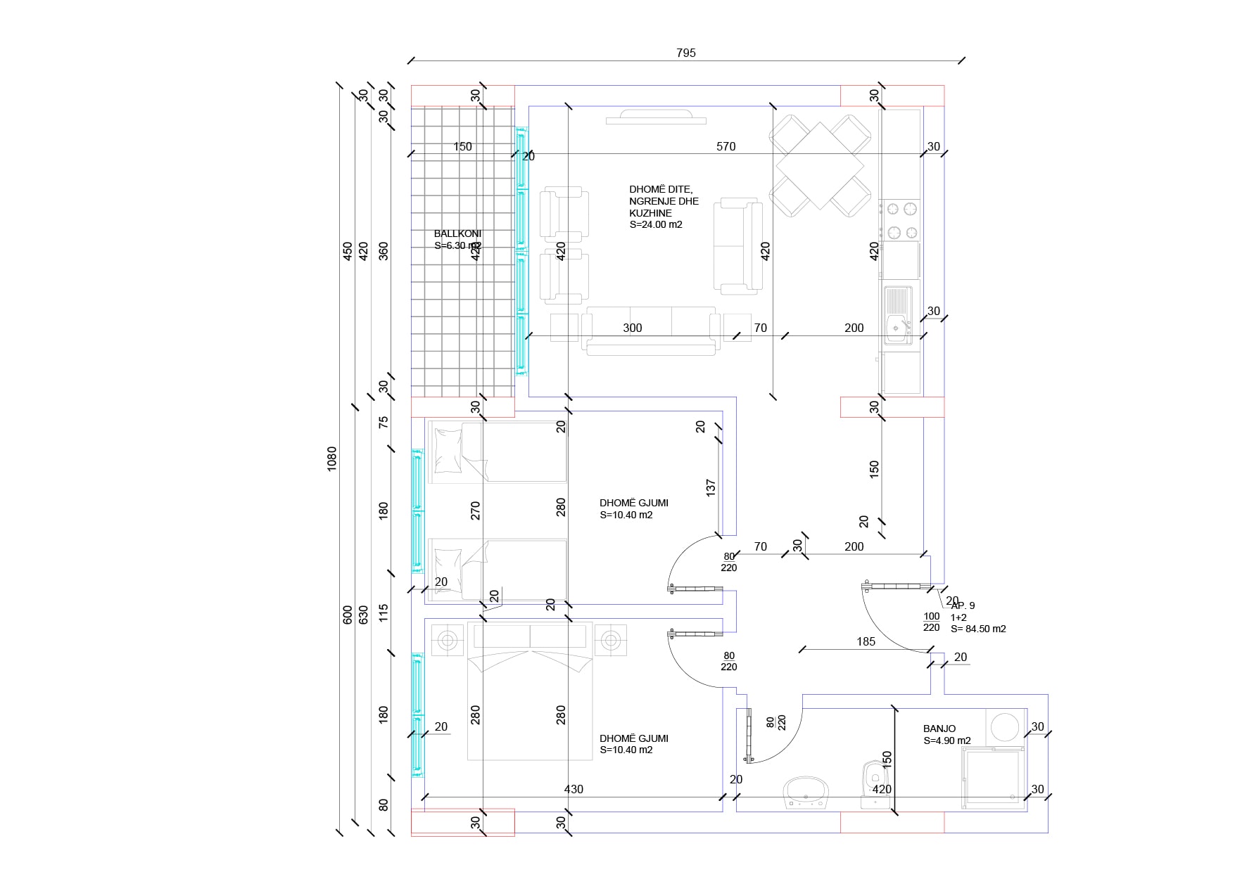 BLLOKU I RI C4-C12, HYRJA C9, KATI 4, BANESA 689, 84.50 m2, Dhomë e ditës, Tryezaria, Kuzhina, 2 Dhoma gjumi, 1 Banjo, Koridor, Ballkon.