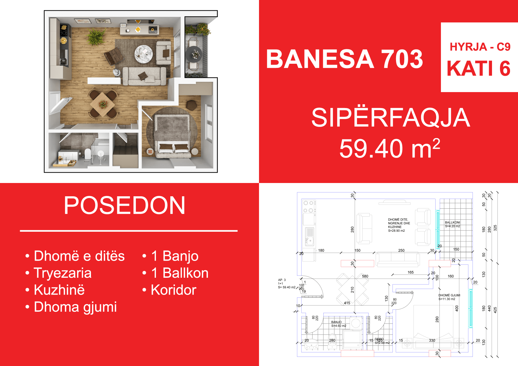 BLLOKU I RI C4-C12, HYRJA C9, KATI 6, BANESA 703, 59.40 m2, Dhomë e ditës, Tryezaria, Kuzhina, Dhomë gjumi, 1 Banjo, Koridor, Ballkon.
