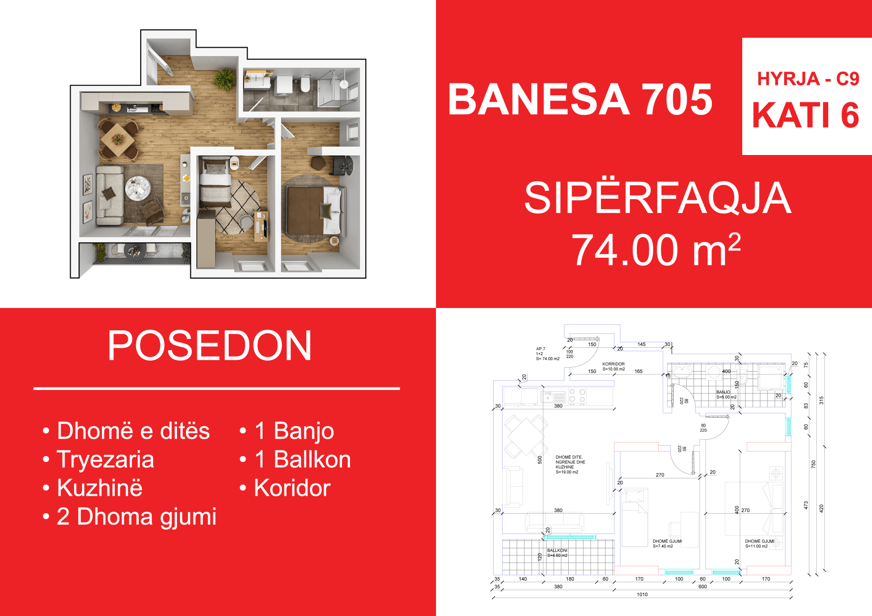 BLLOKU I RI C4-C12, HYRJA C9, KATI 6, BANESA 705, 74.00 m2, Dhomë e ditës, Tryezaria, Kuzhina, 2 Dhoma gjumi, 1 Banjo, Koridor, Ballkon.