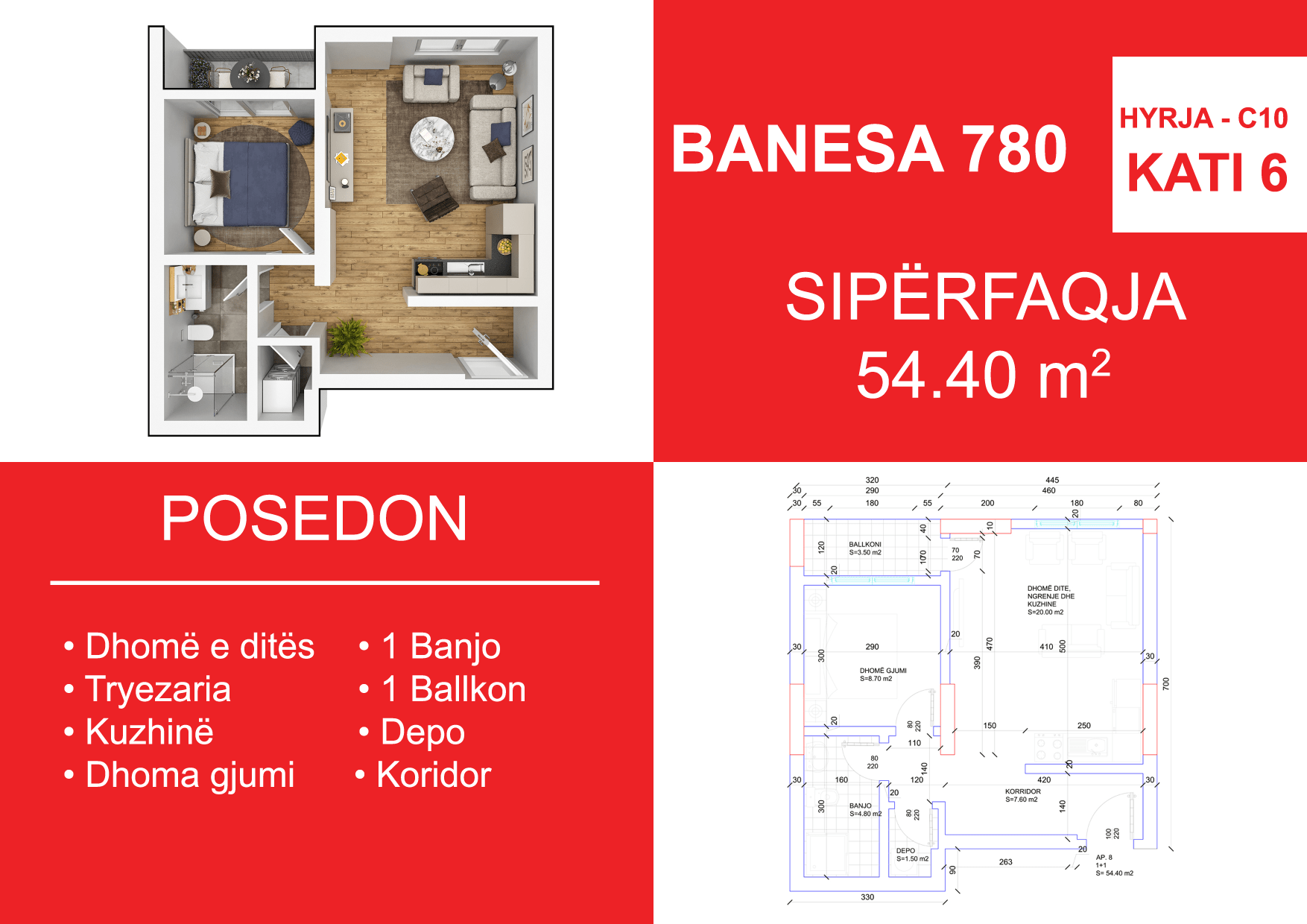 BLLOKU I RI C4-C12, HYRJA C10, KATI 6, BANESA 780, 54.40 m2, Dhomë e ditës, Tryezaria, Kuzhina, 1 Dhomë gjumi, 1 Banjo, Koridor, 1 Ballkon.
