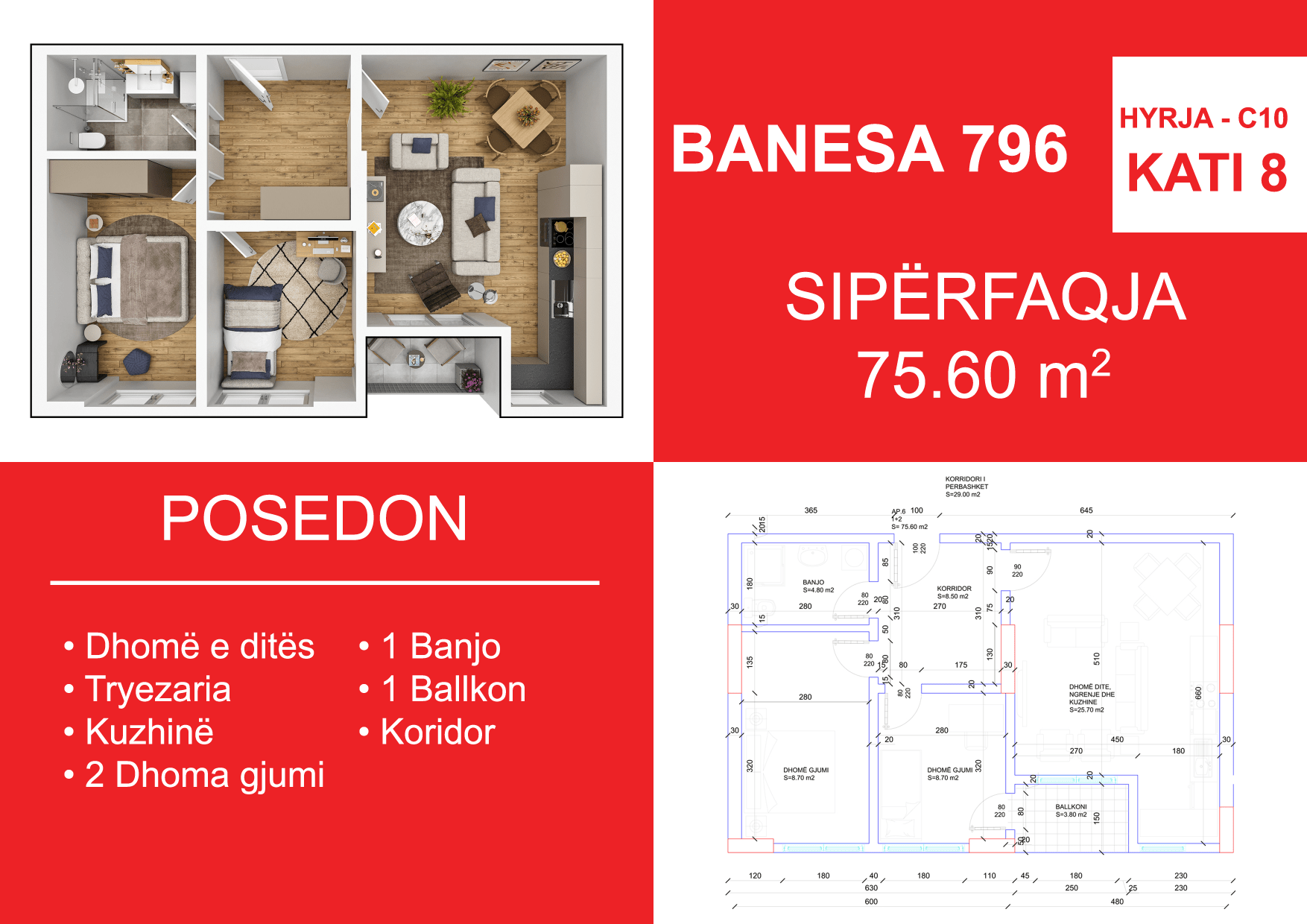 BLLOKU I RI C4-C12, HYRJA C10, KATI 8, BANESA 796, 75.60 m2, Dhomë e ditës, Tryezaria, Kuzhina, 2 Dhoma gjumi, 1 Banjo, Koridor, 1 Ballkon.