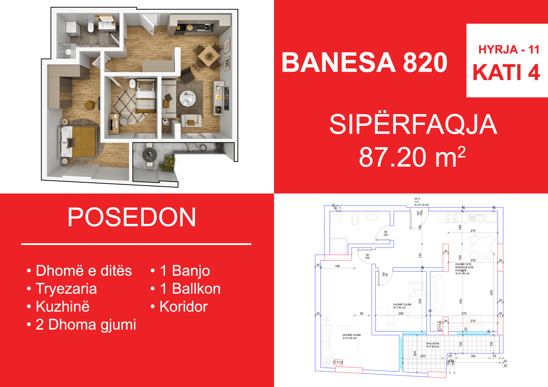 BLLOKU I RI C4-C12, HYRJA C11, KATI 4, BANESA 820, 87.20 m2, Dhomë e ditës, Tryezaria, Kuzhina, 2 Dhoma gjumi, 1 Banjo, Koridor, Ballkon.