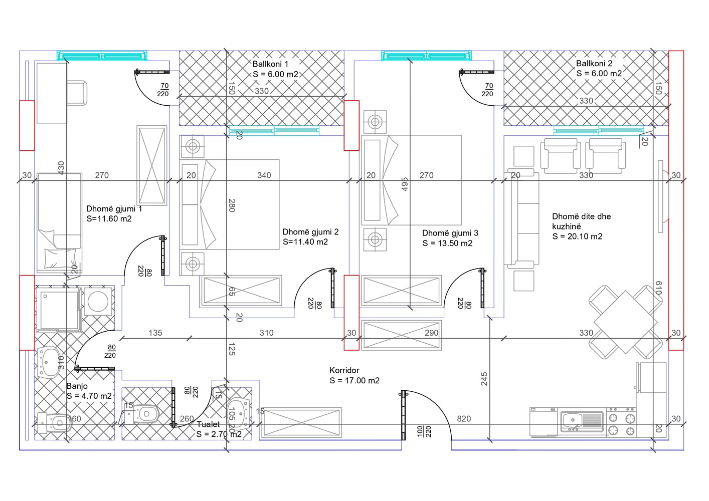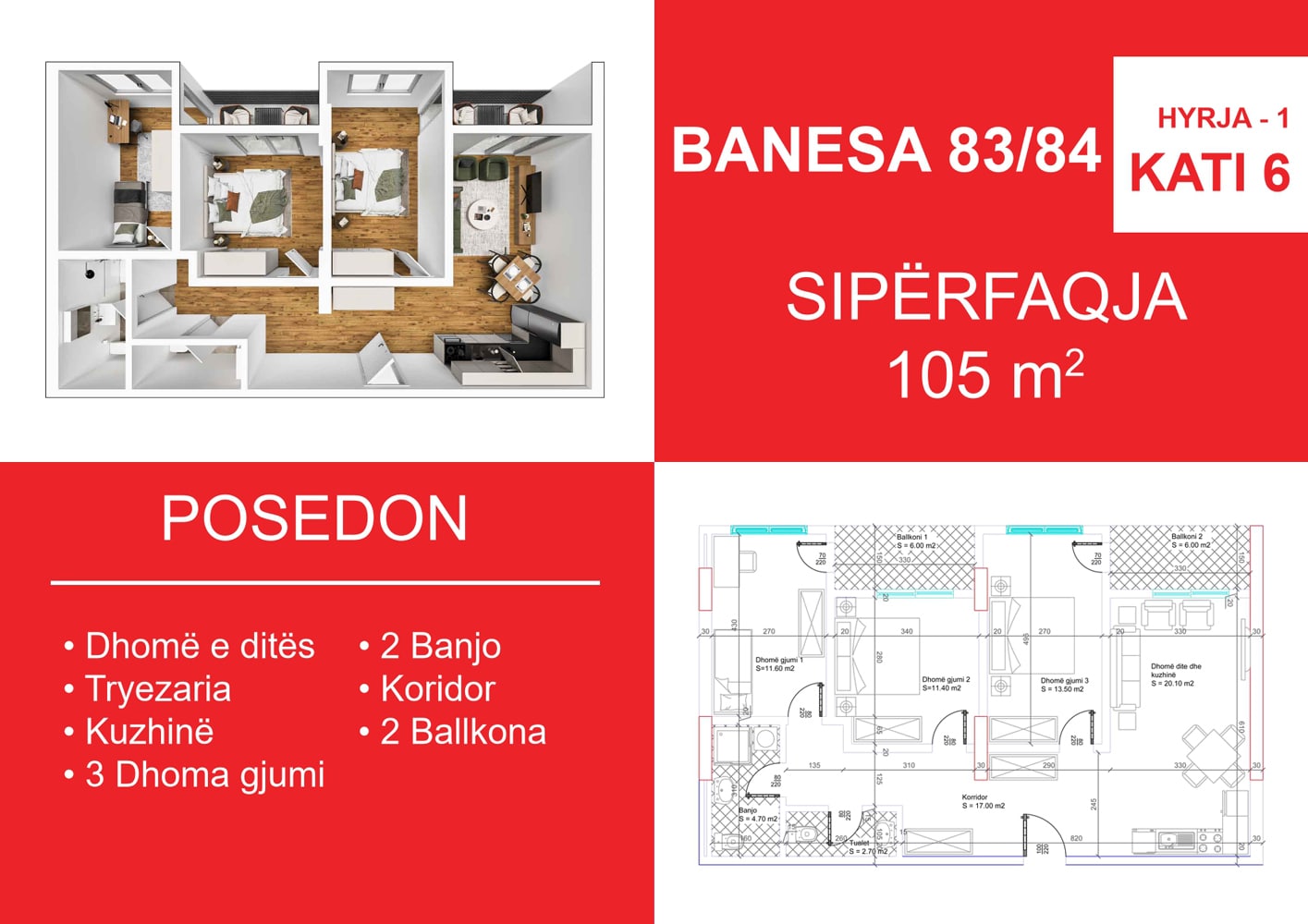 BLLOKU I RI C, HYRJA 1, KATI 6, BANESA 83/84, 105 m2, Dhomë e ditës, Tryezaria, Kuzhina, 3 Dhoma gjumi, 2 Banjo, Koridor, 2 Ballkona.