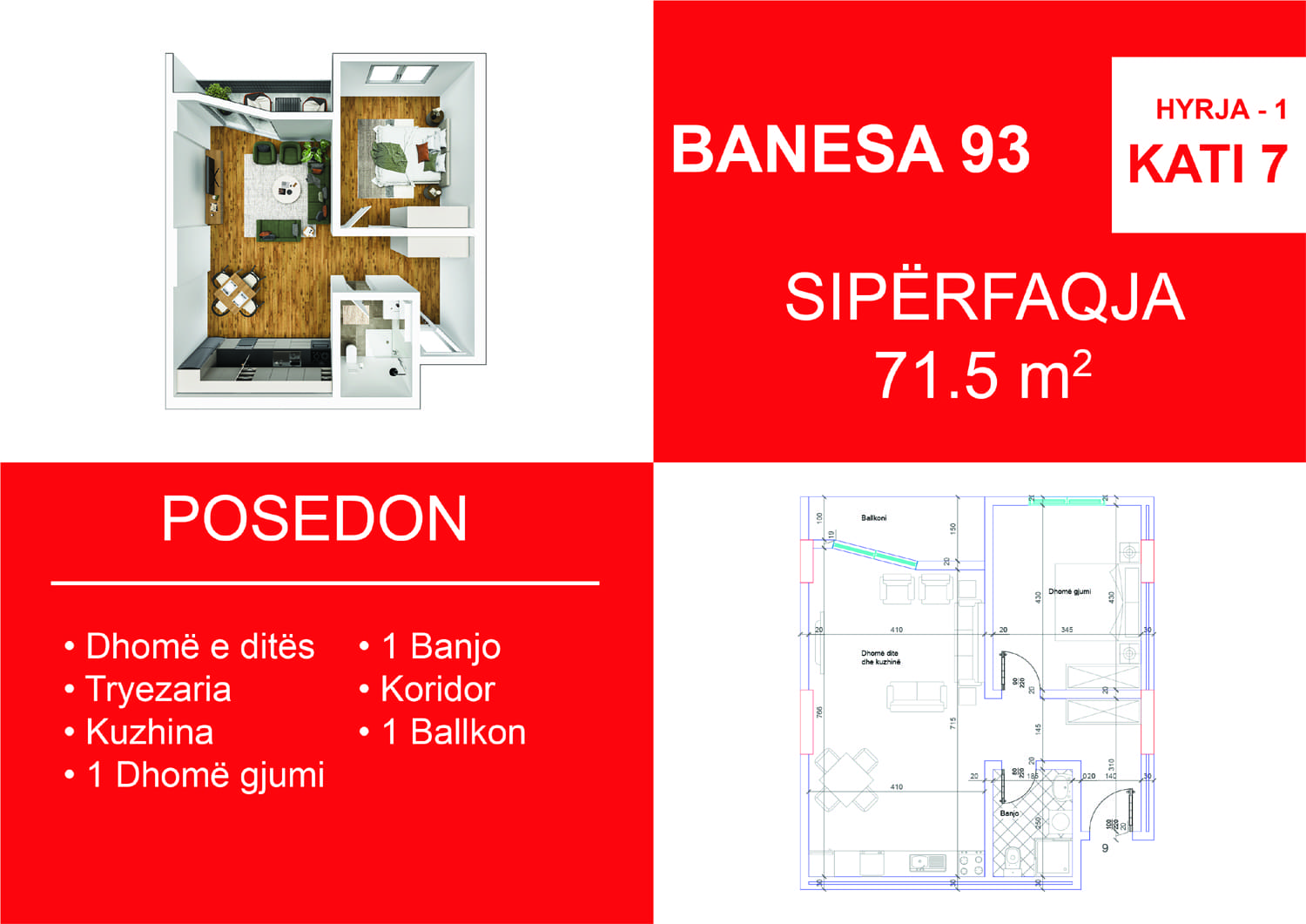 BLLOKU I RI C, HYRJA 1, KATI 7, BANESA 93, 71.5 m2, Dhomë e ditës, Tryezaria, Kuzhina, 1 Dhomë gjumi, 1 Banjo, Koridor, 1 Ballkon.